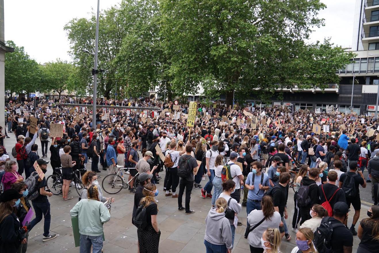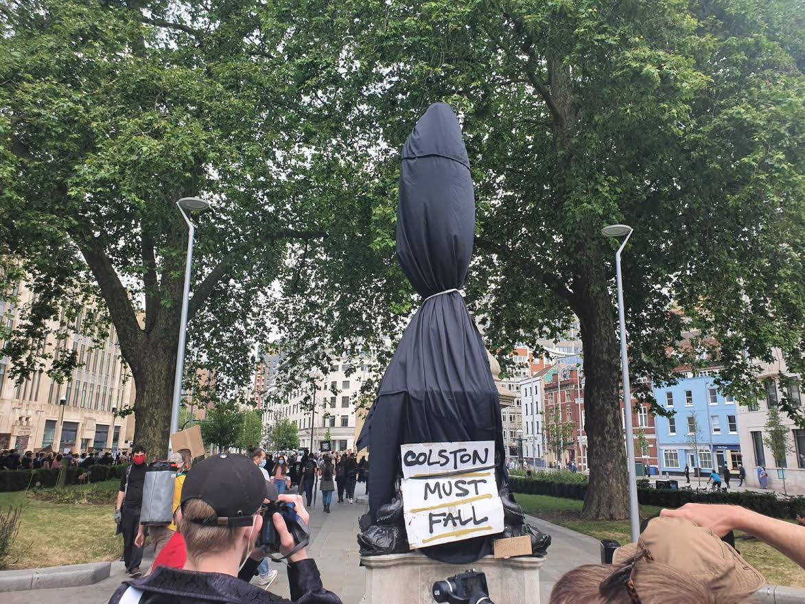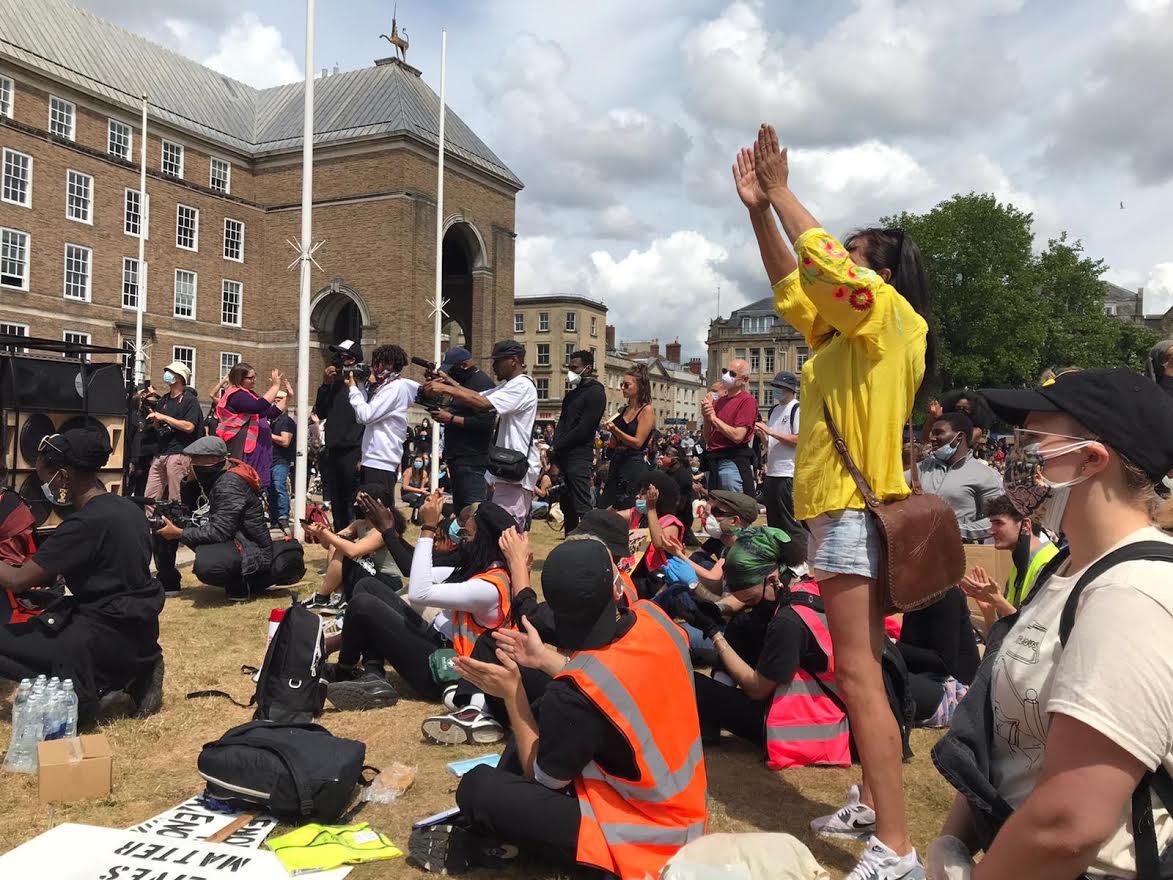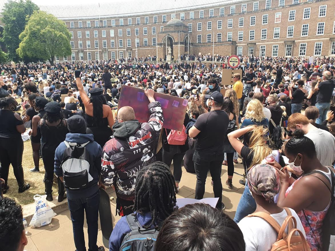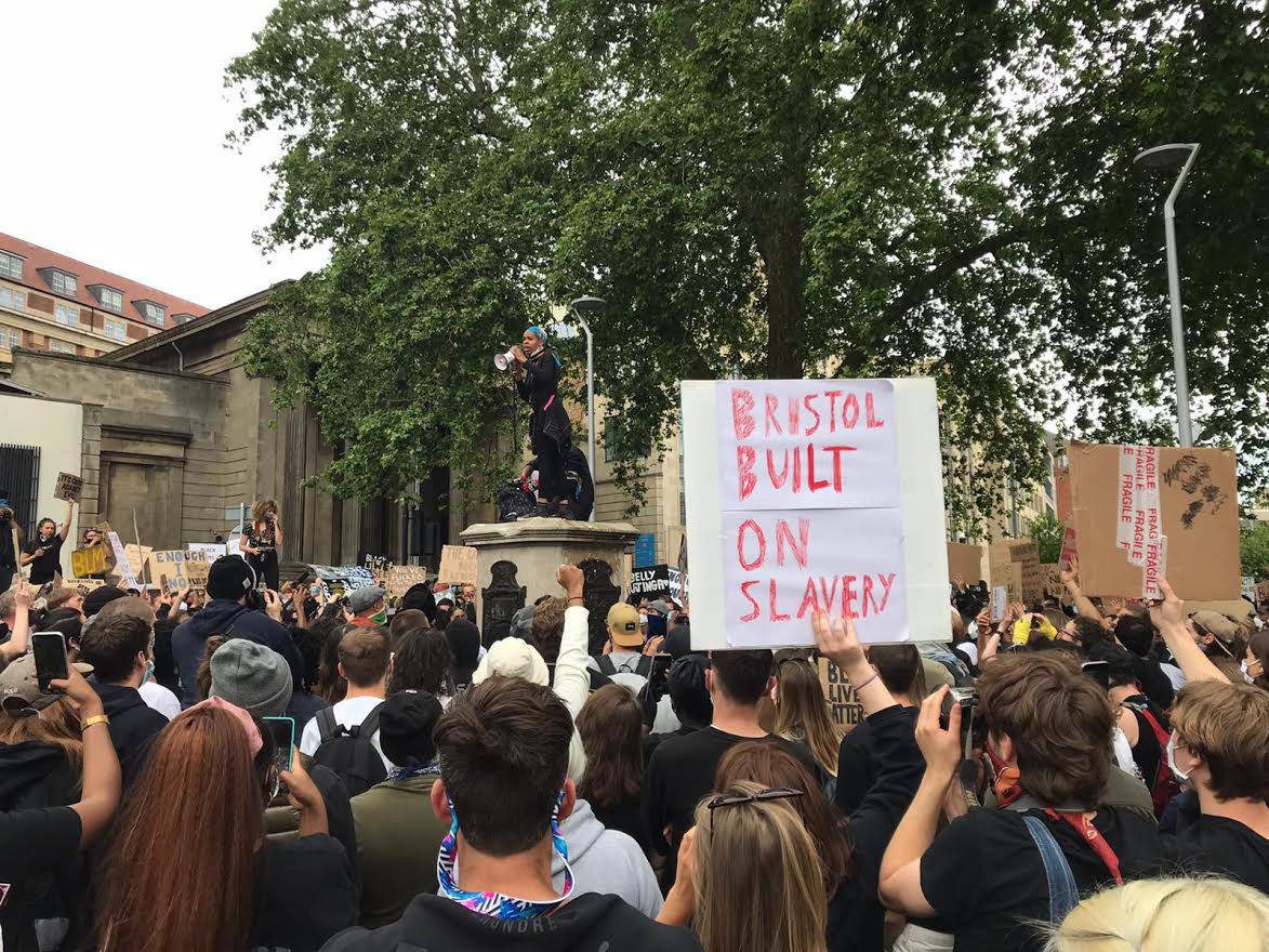 Crowds watch speeches on what was the Colston statue. Photo: Phil Riley
