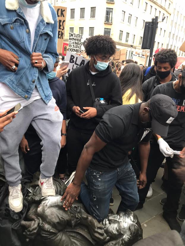 Protesters knelt on the neck of the toppled statue of Colston for a symbolic eight minutes. Photo: Martin Booth