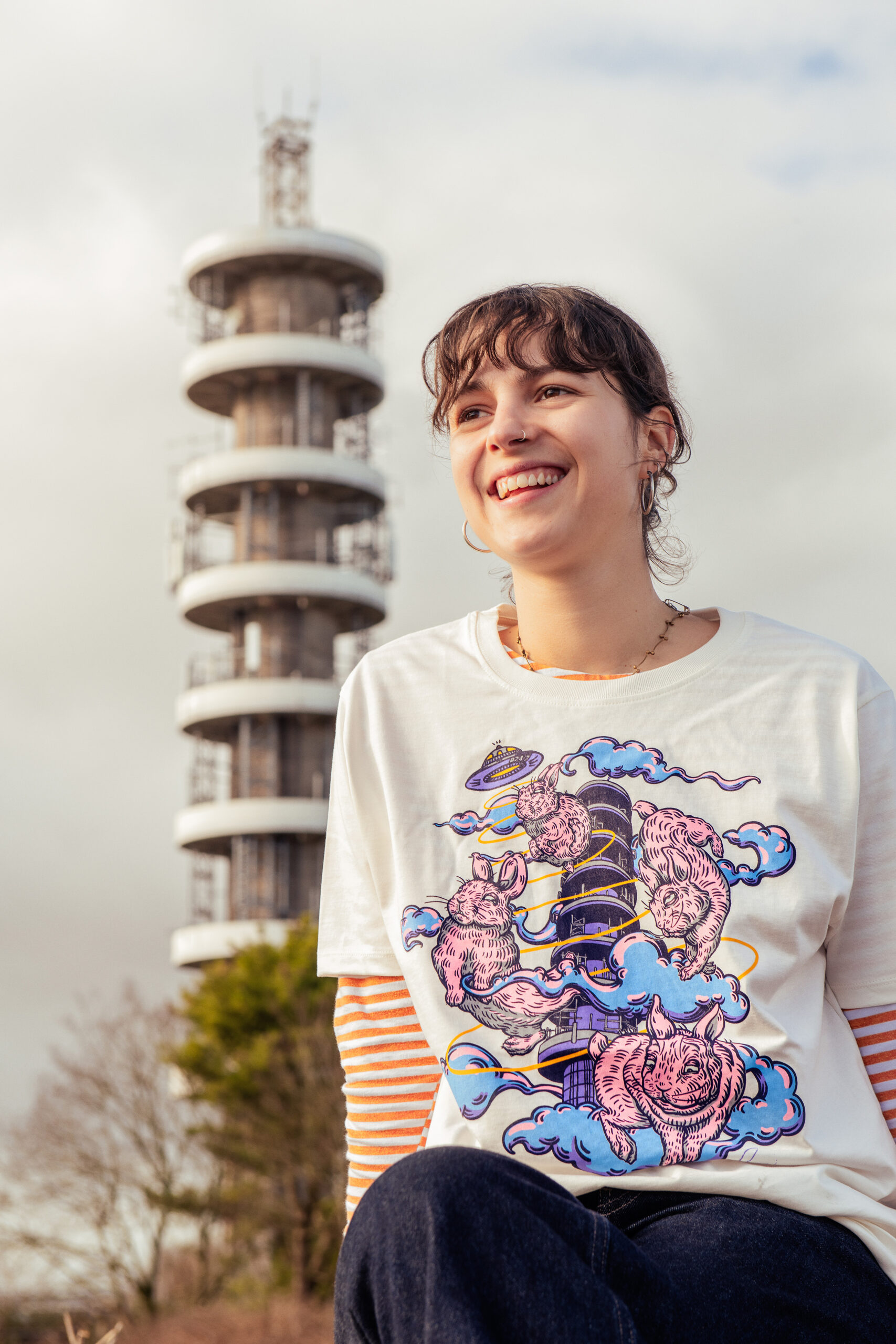 The Lucas Antics design incorporates the BT Tower that watches over Purdown and Stoke Park – an area of solace for many a Bristolian over the years, including our artist. They’ve combined the famous silhouette with their unique colourful dream-like style and colours, along with a few rabbits floating around the tower for good measure. Oh, and it’s being abducted by aliens.