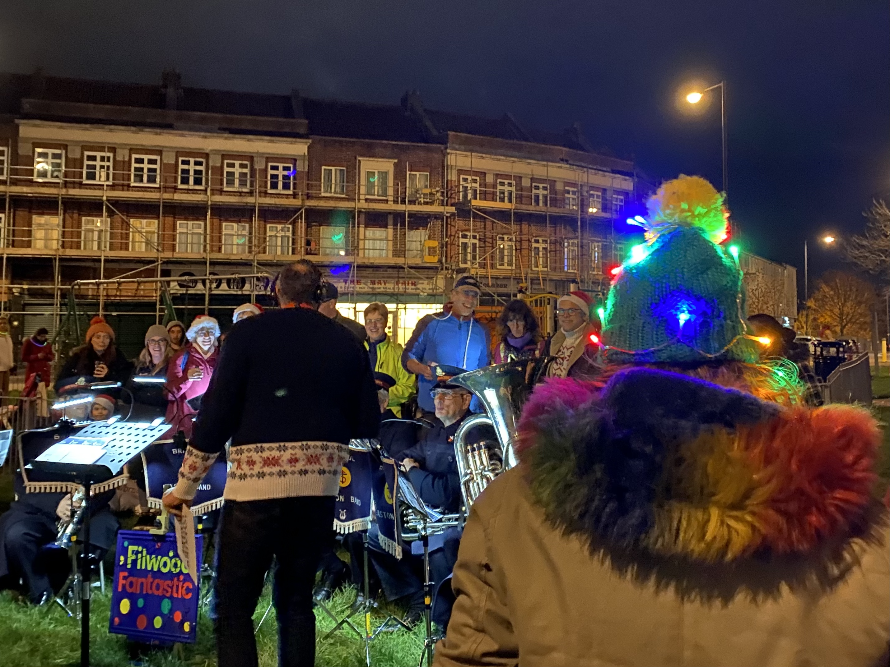 Carol singing on Filwood Broadway was broadcast live on BBC Radio Bristol. Photo by Charlie Watts