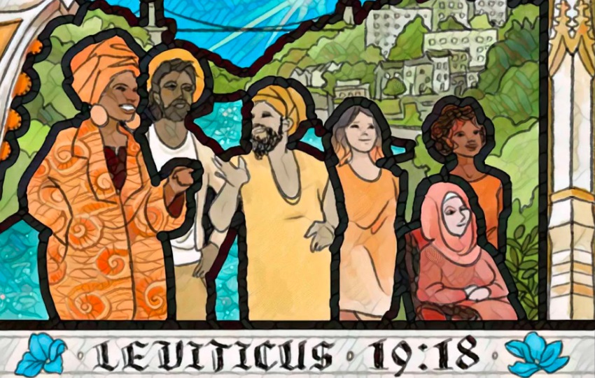 Underneath the four panels runs a call to ‘Love your neighbour’, with the design referencing the style of the removed panels,