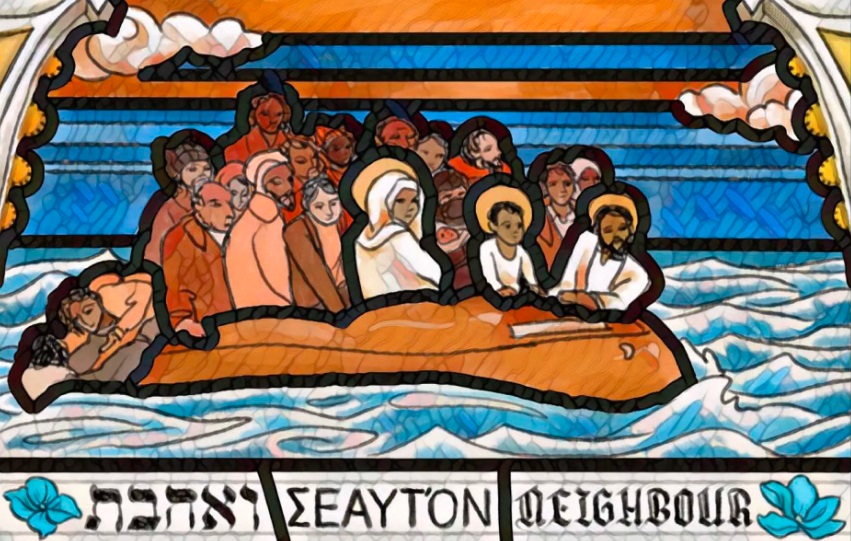 The other panels portray the current refugee crisis and Jesus as a child refugee fleeing to Egypt, and a diverse group of neighbours “facing the future in a display of hope and togetherness”.