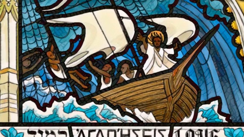 The first panel depicts a Bristol ship traversing the raging seas of the Middle Passage during the Transatlantic Slave Trade, and references the story of Jesus calming the storm