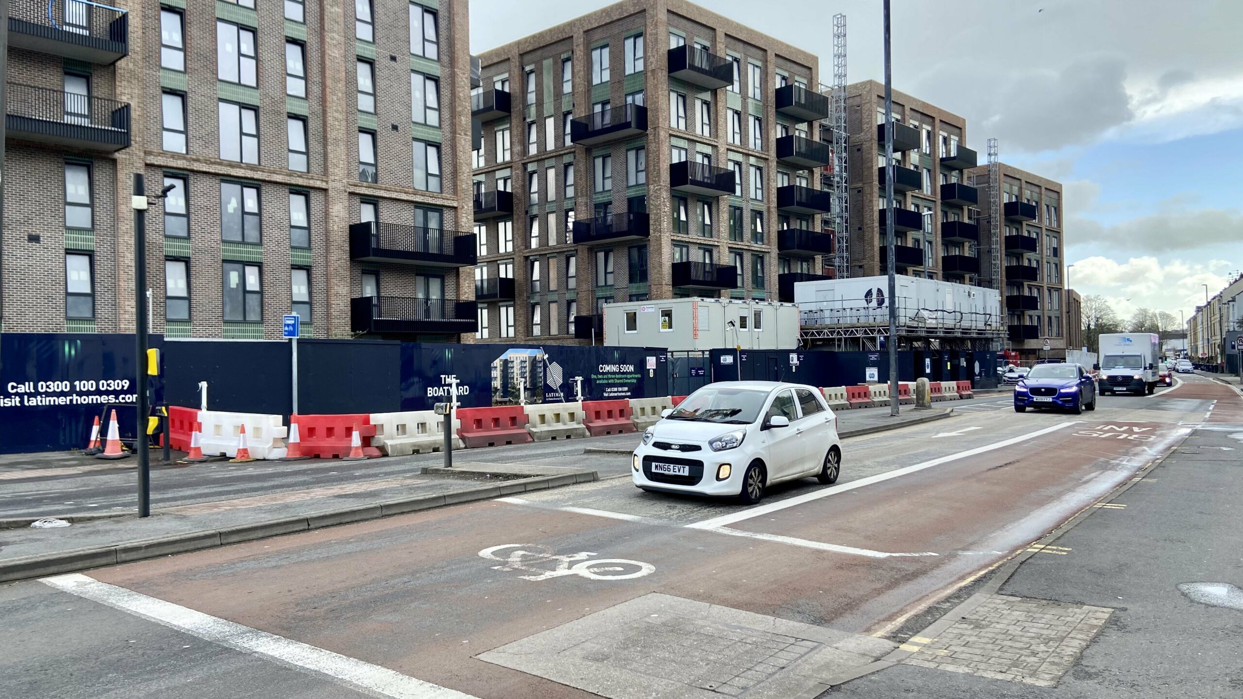 The hoardings blocked a bus lane outside the Boatyard development – photo: Matt Ringshaw