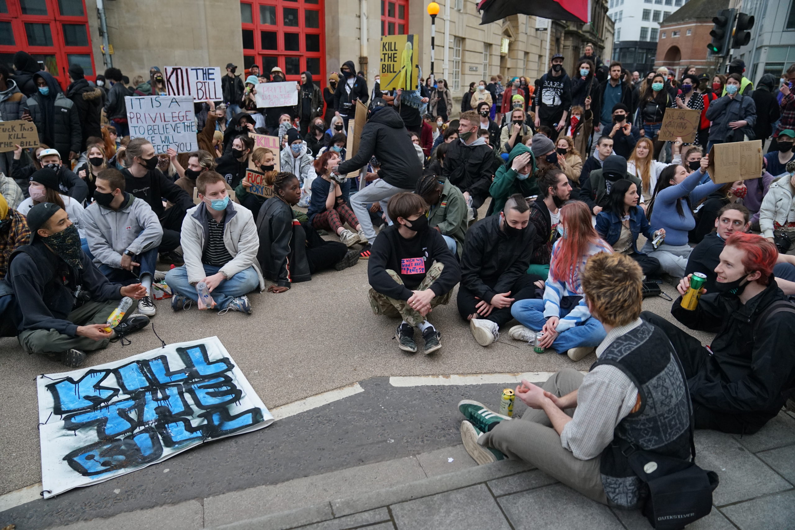 Kill the Bill protesters sitting down outside Bridewell police station – photo: Phil Riley