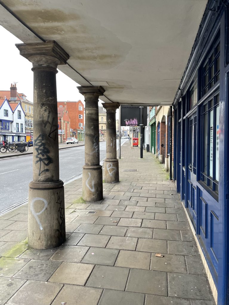Built in 1706, Kingsley Hall oversails the pavement on five stout columns – photo: Martin Booth