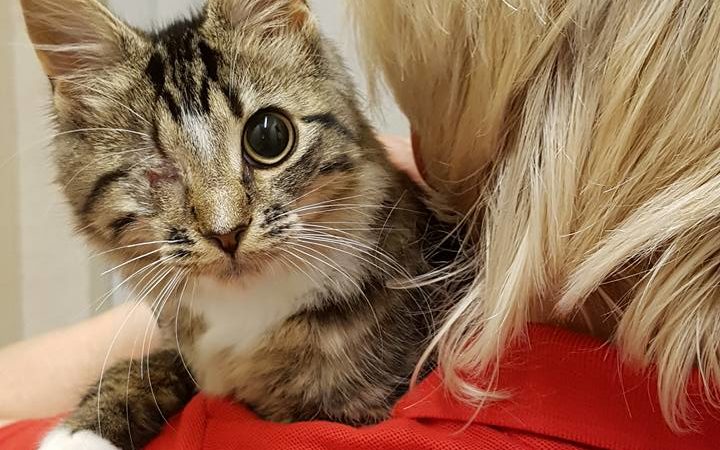 Holly tells the tale of four-month-old Peanut (pictured above) who arrived at Holly Hedge with just one eye and was given emergency eye surgery.