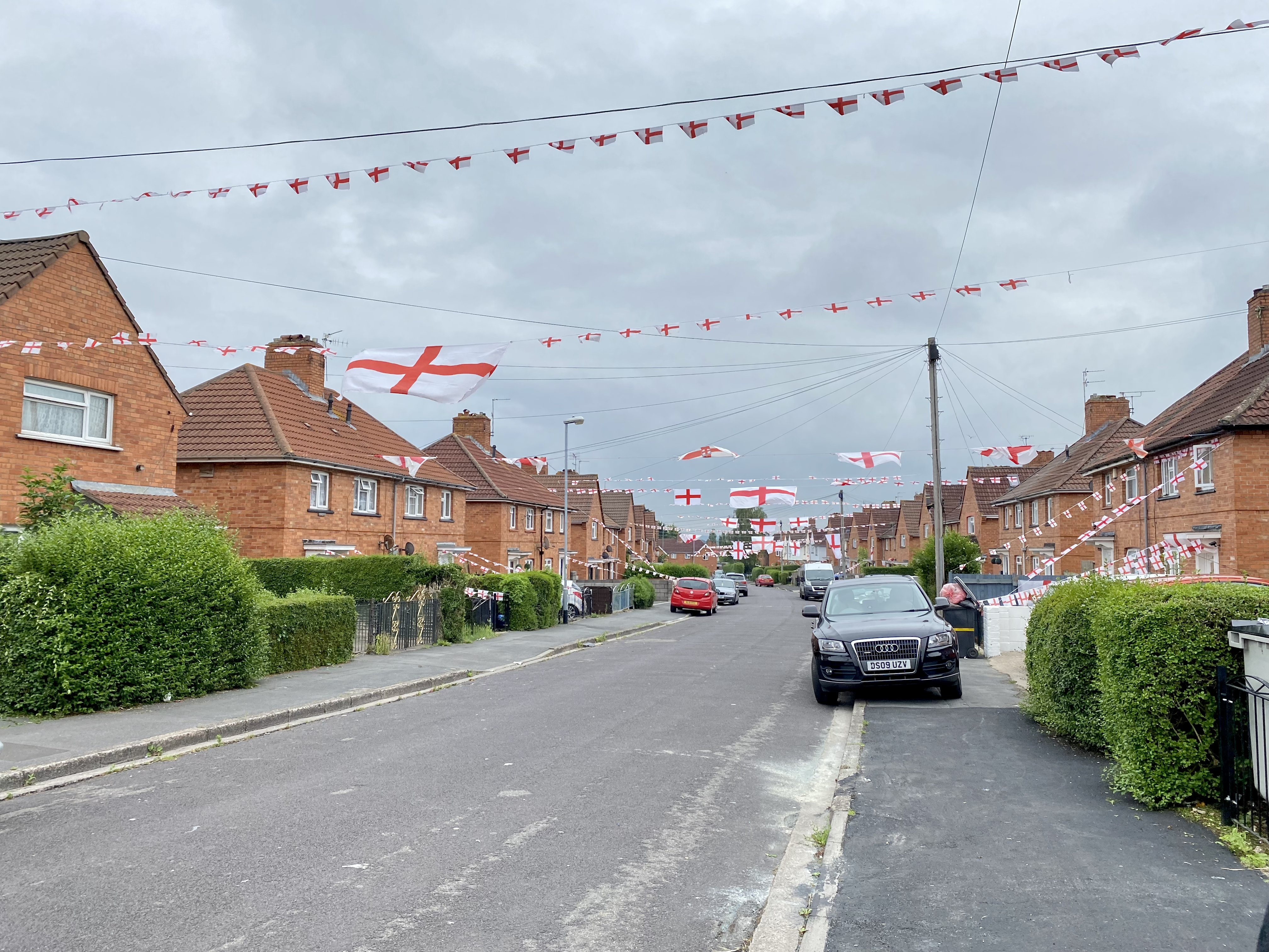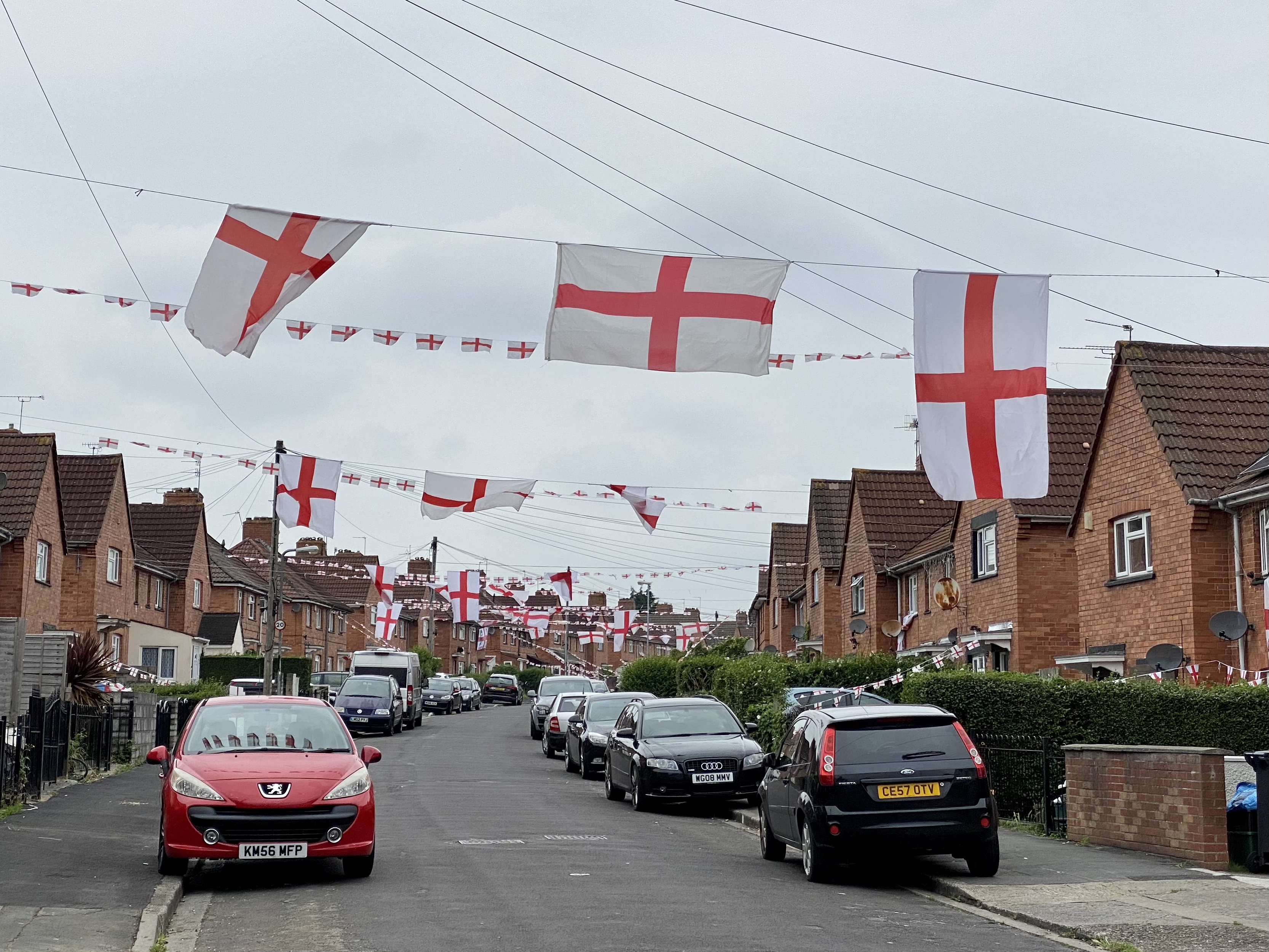 A street in Knowle West is full with England flags, Photo by Charlie Watts