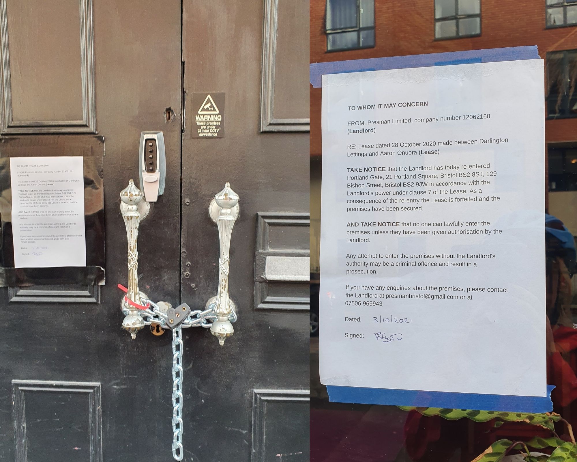 The locked door and notice from the landlord on the window of Hidden Corner – photos by Ellie Pipe