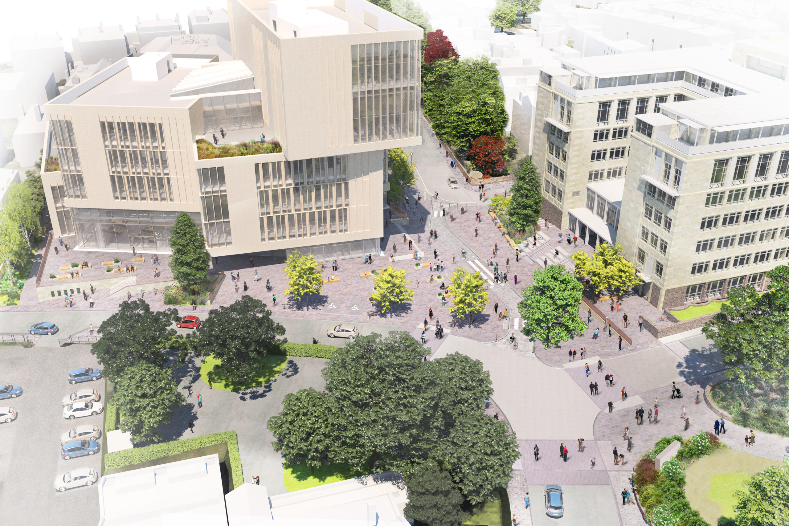 The proposed new library “forms a key part of the University’s vision and strategy for transforming our Clifton campus, which includes providing new and enhanced facilities, improvements to public spaces and creating a welcoming heart to the University for students, staff and the wider community” – image: Grant Associates