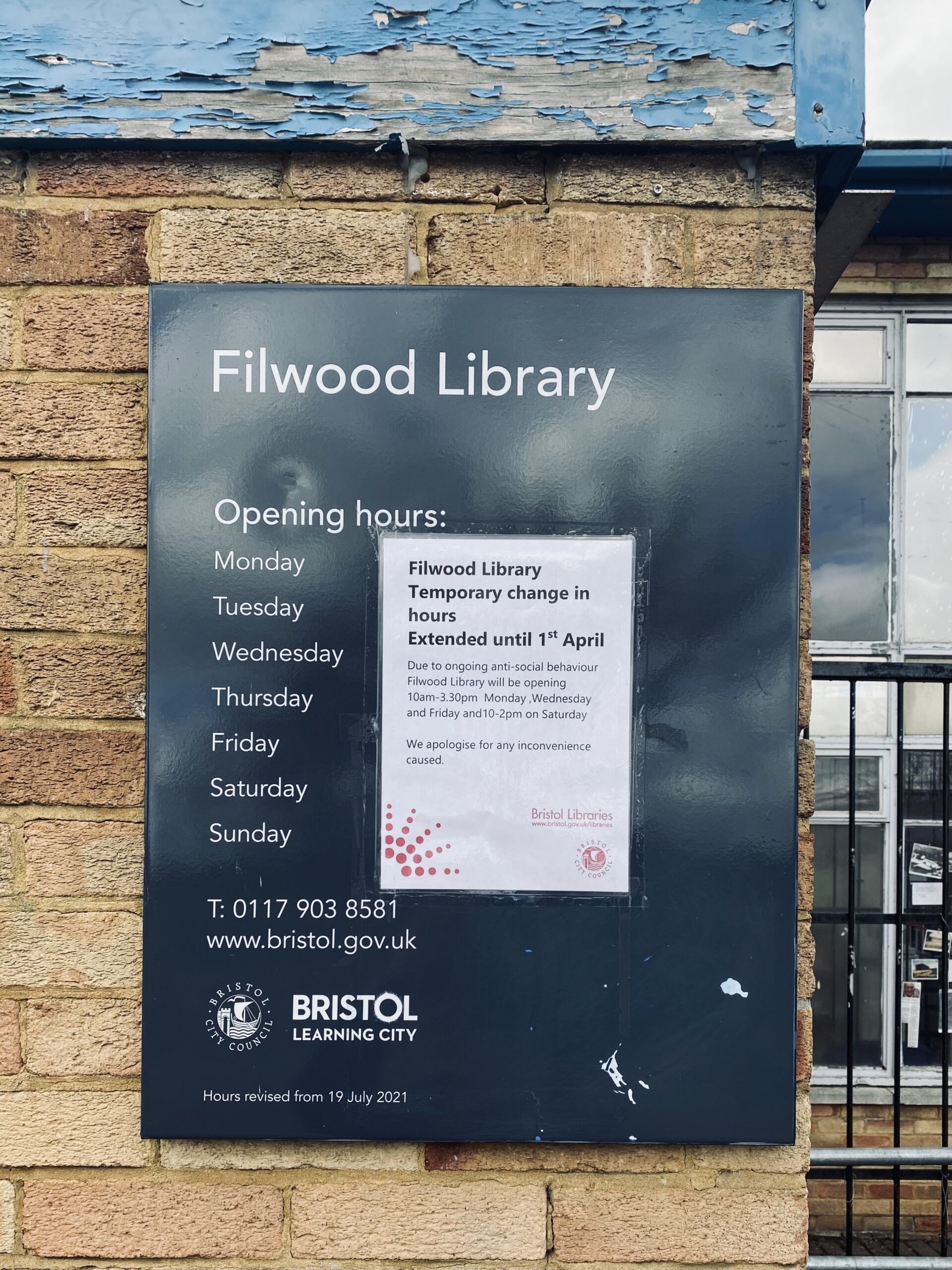 A notice outside Filwood Library says its opening hours have been altered due to anti-social behaviour – photo: Charlie Watts