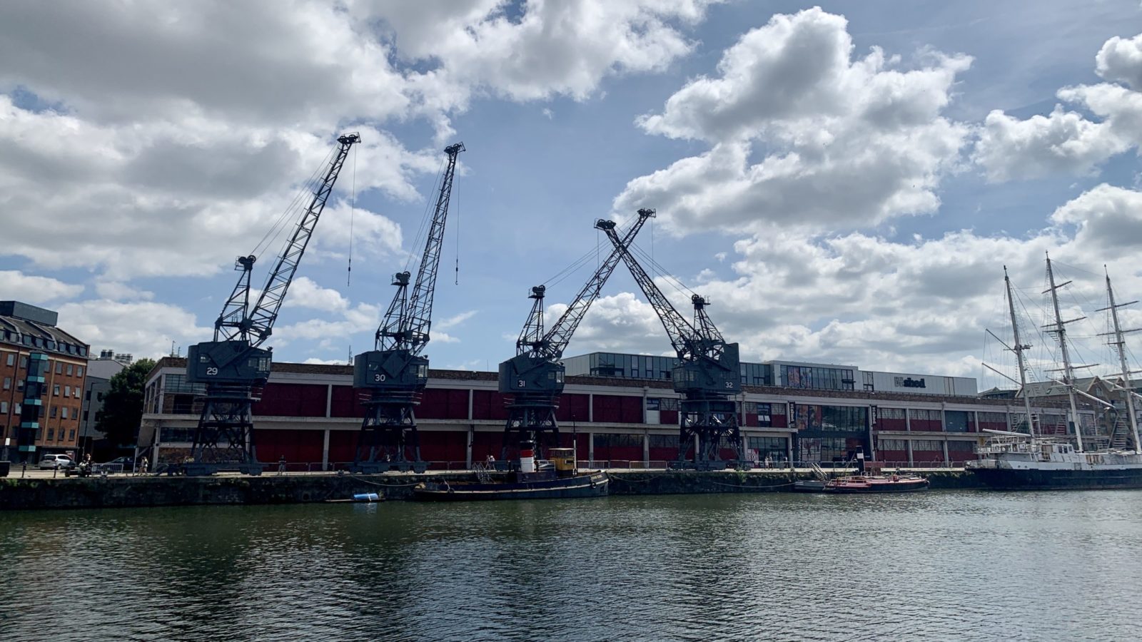 M Shed has lowered and crossed jibs of two of its historic waterfront cranes to honour retired industrial and maritime history curator Andy King.