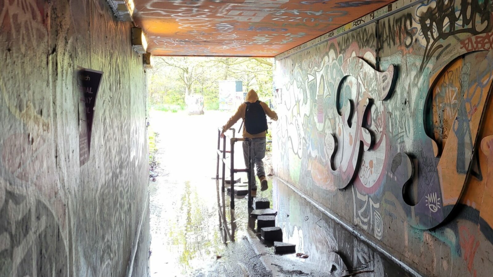 Someone has placed a number of breeze blocks and large stones to act as stepping stones in the underpass to enable pedestrians to get through without getting their feet soaking wet, although it’s not a solution that will help pushchair or wheelchair users.