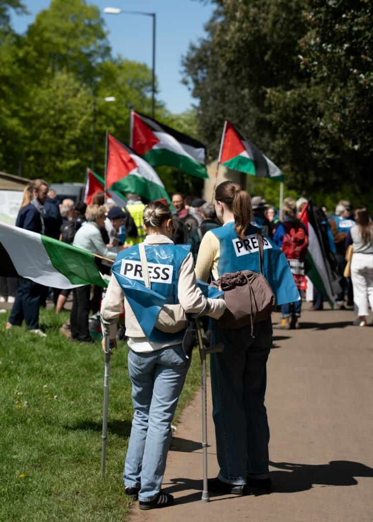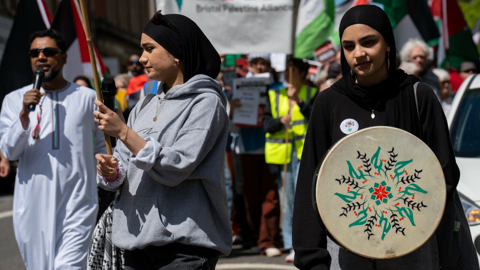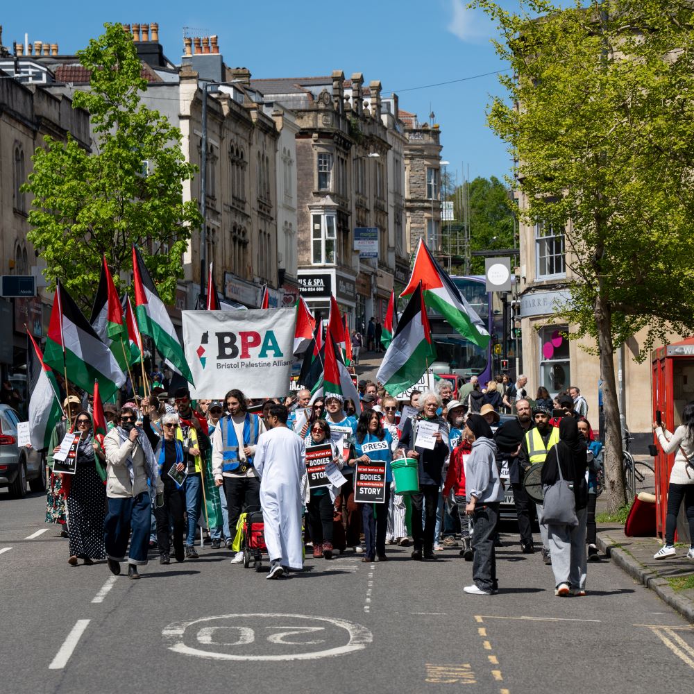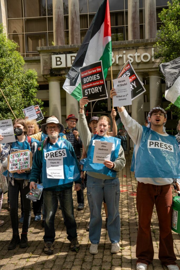 On their way from the Downs, the march stopped on Whiteladies Road outside the Bristol headquarters of the BBC, who protesters claim show “complicity in the genocide” in their news coverage.