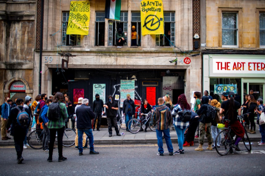 Two protesters were arrested as around 50 people gathered around a squat opposite Castle Park.