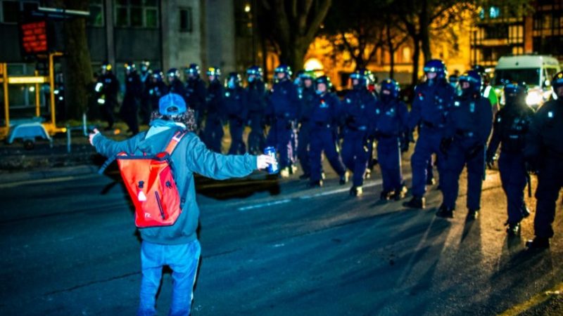 “Officers encouraged people to disperse, but items including bottles, cans, paint and eggs were thrown at them by a small number of people in the crowd and from within the nearby building.”