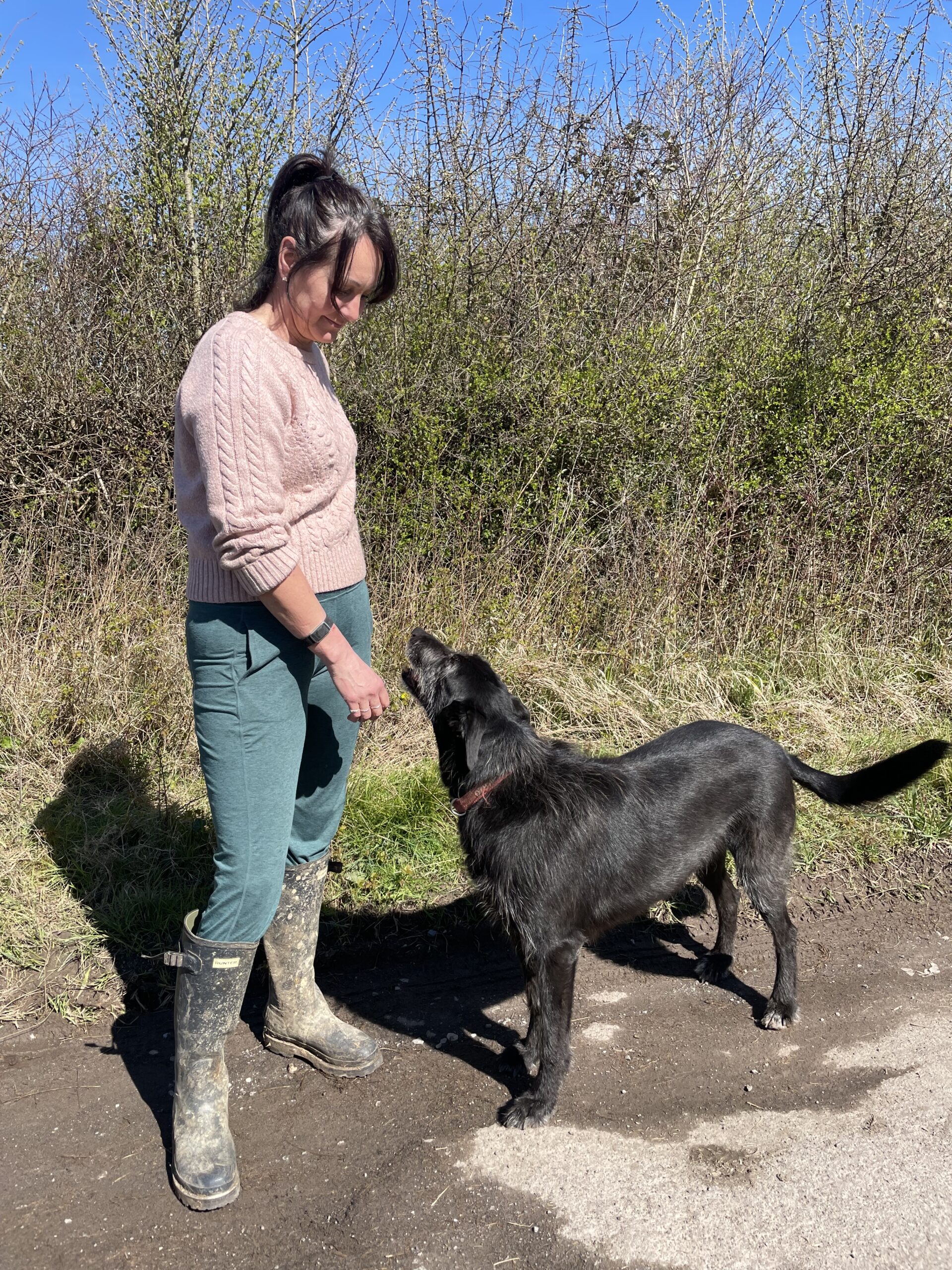 Catherine Withers in front of the ancient hedgerow on Yew Tree Farm – photo: Martin Booth