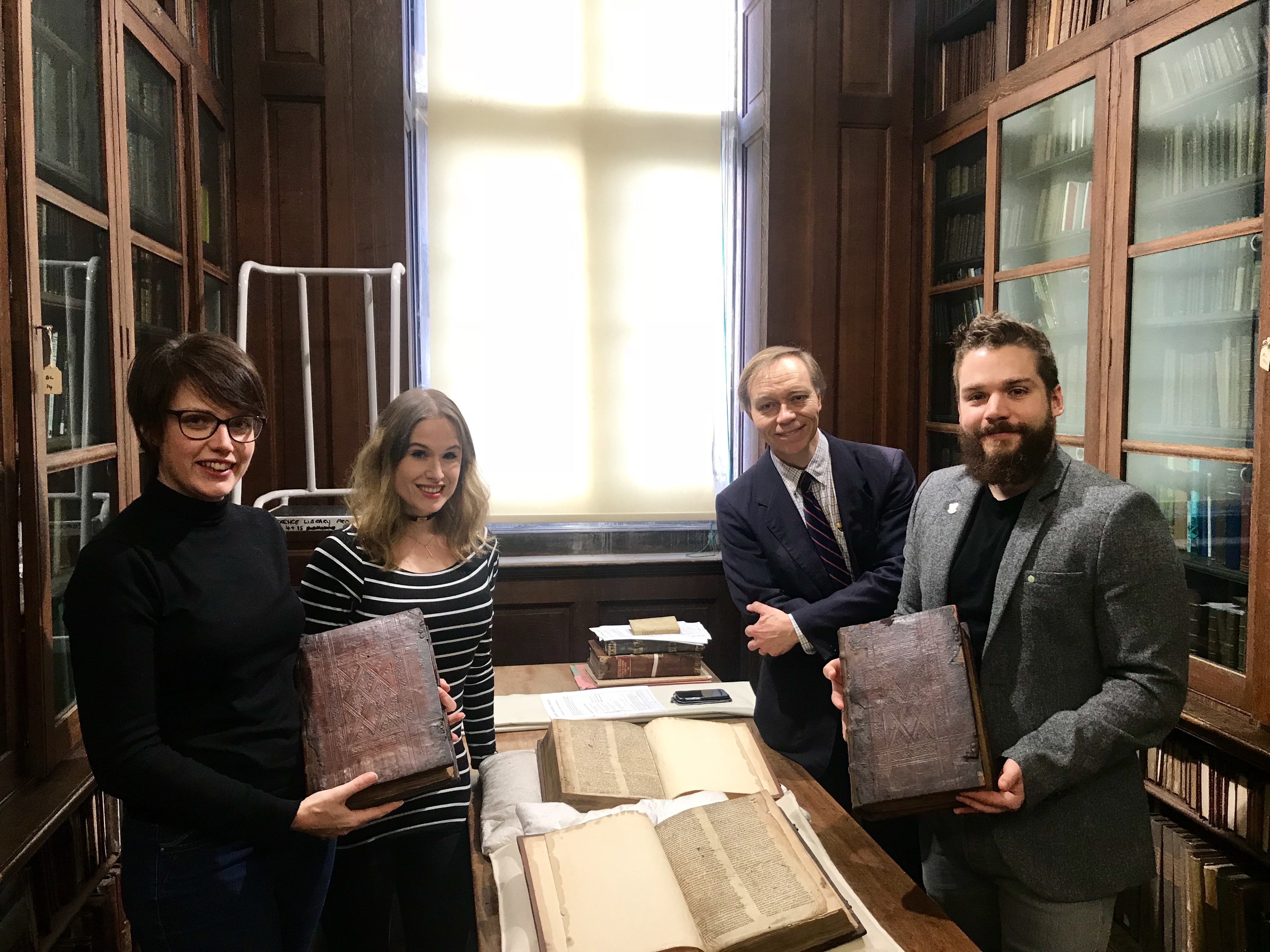 Left to right: Leah Tether, Laura Chuhan Campbell, Michael Richardson and Benjamin Pohl with the books in Bristol Central Library’s Rare Books Room – photo courtesy of University of Bristol