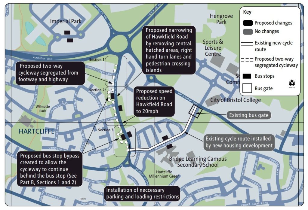 A two-way segregated bike path would also be built along Hawkfield Road, which is currently a “shared use” path. Hundreds of new homes are under construction in the area, so demand for getting into the city via all modes of transport is expected to shoot up.