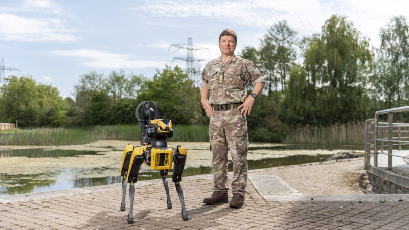 Colonel Dan Anders-Brown pictured with a robotic dog – photo: MoD Defence Equipment and Support