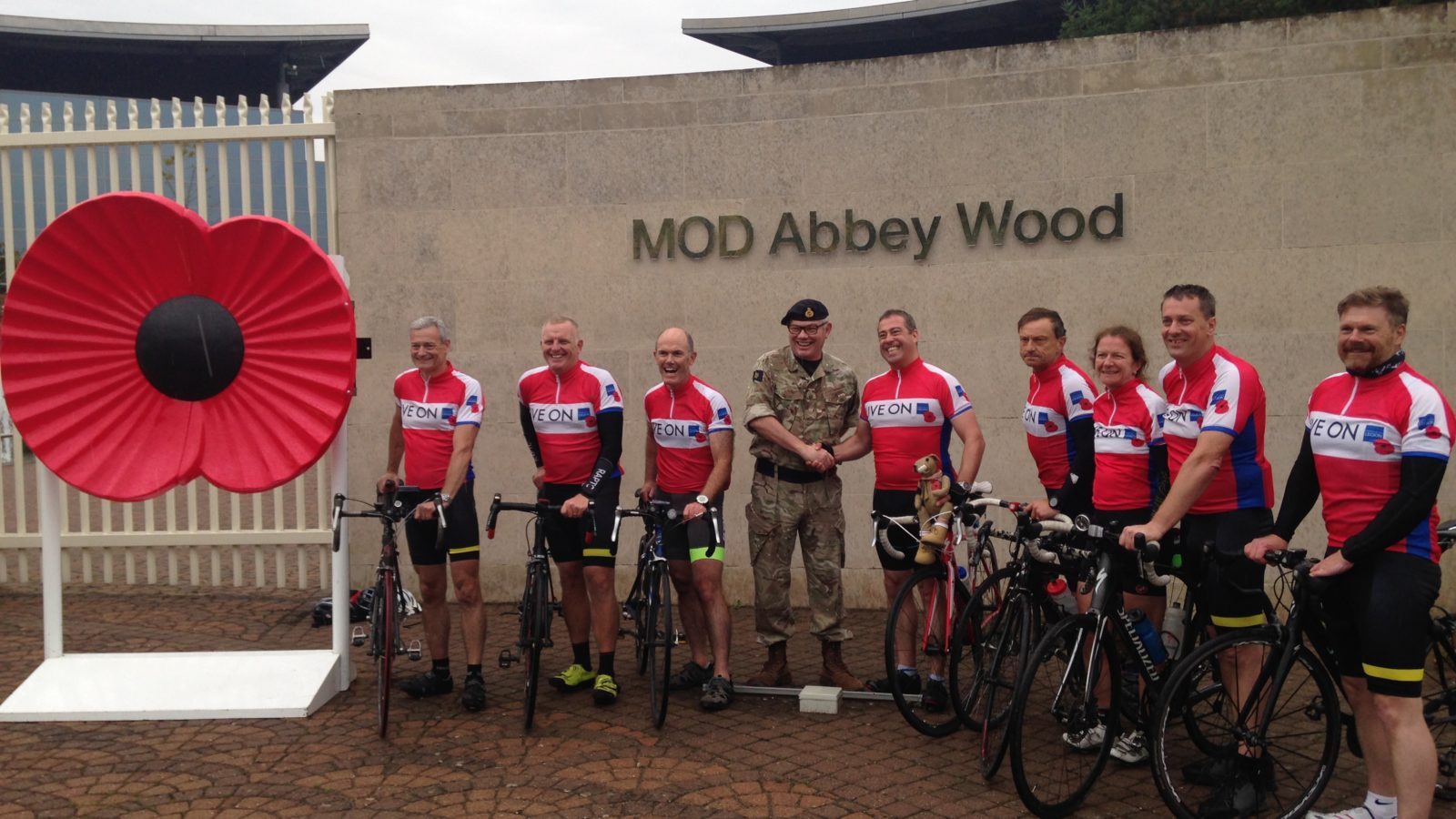 There’s an air of both celebration and commemoration at the entrance of the Ministry of Defence complex at Abbey Wood, as the team of cyclists from the base, who set out from Ypres last week, finally complete the long journey home to Bristol.