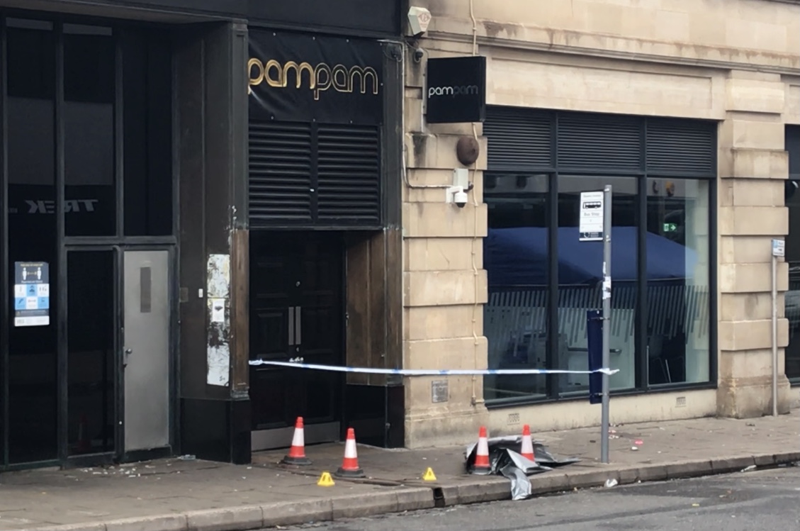 Yellow police evidence markers can be seen on the ground outside the entrance to Pam Pam – photo: Martin Booth