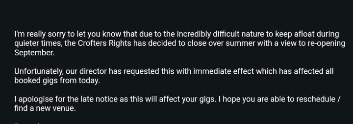 Bloomsbury Leisure Group, the firm behind The Crofters Rights, sent this message to gig promoters in response to queries about the closure. photo – Matt Barrow