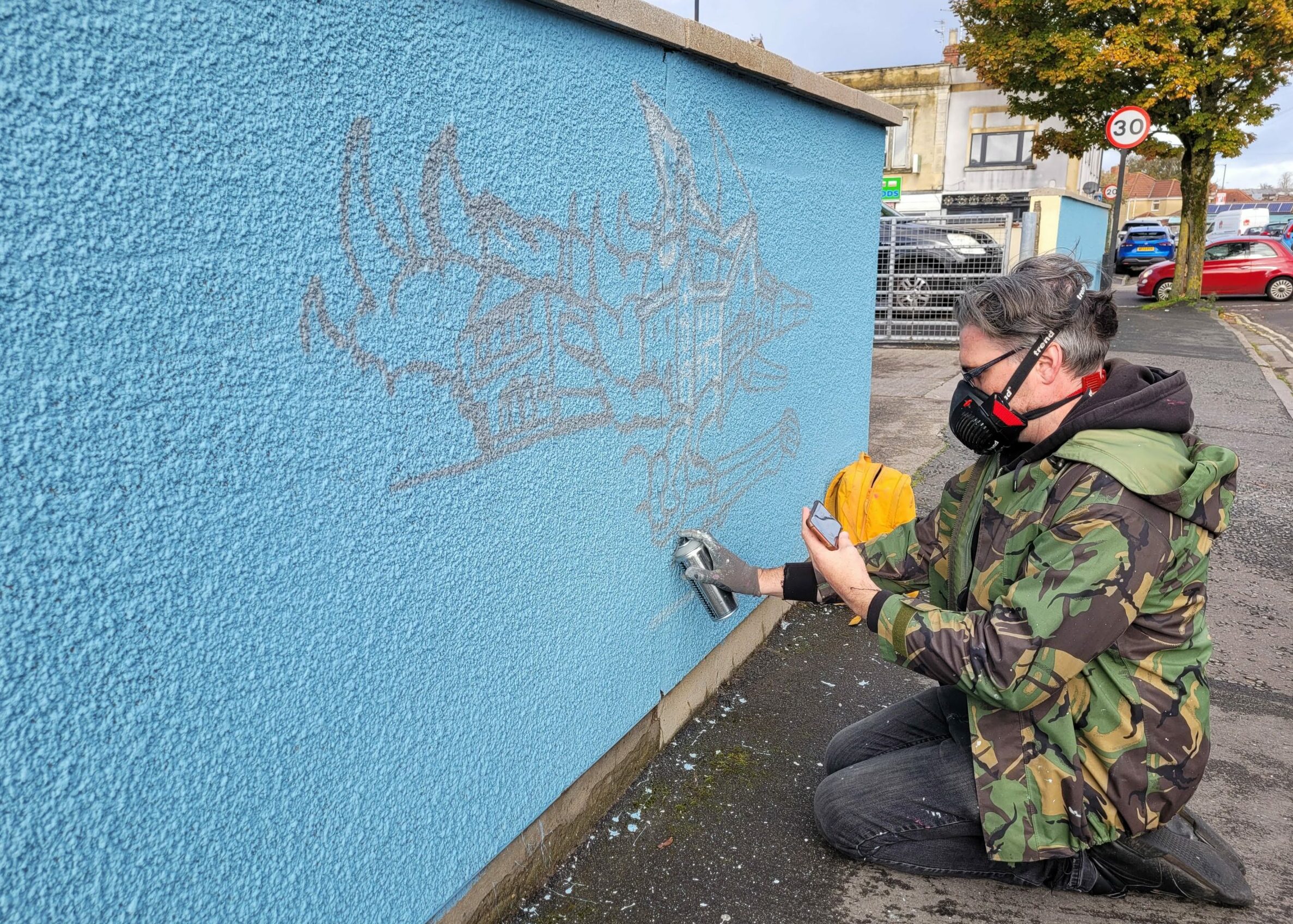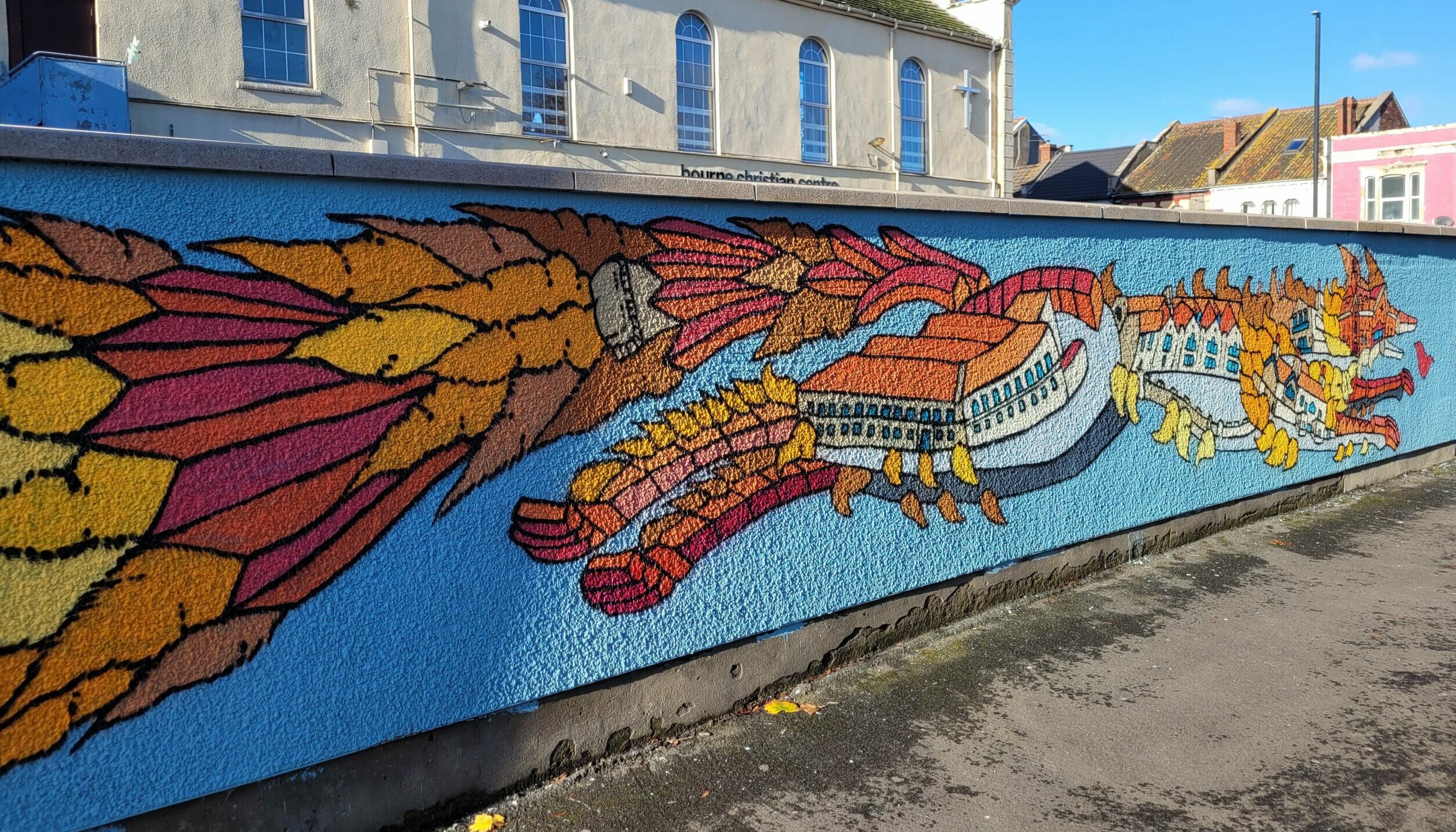 “It’s involved a lot of community engagement,” said Andy, pausing in his work on the second part of the mural on Waters Road by the Bourne Christian Centre.