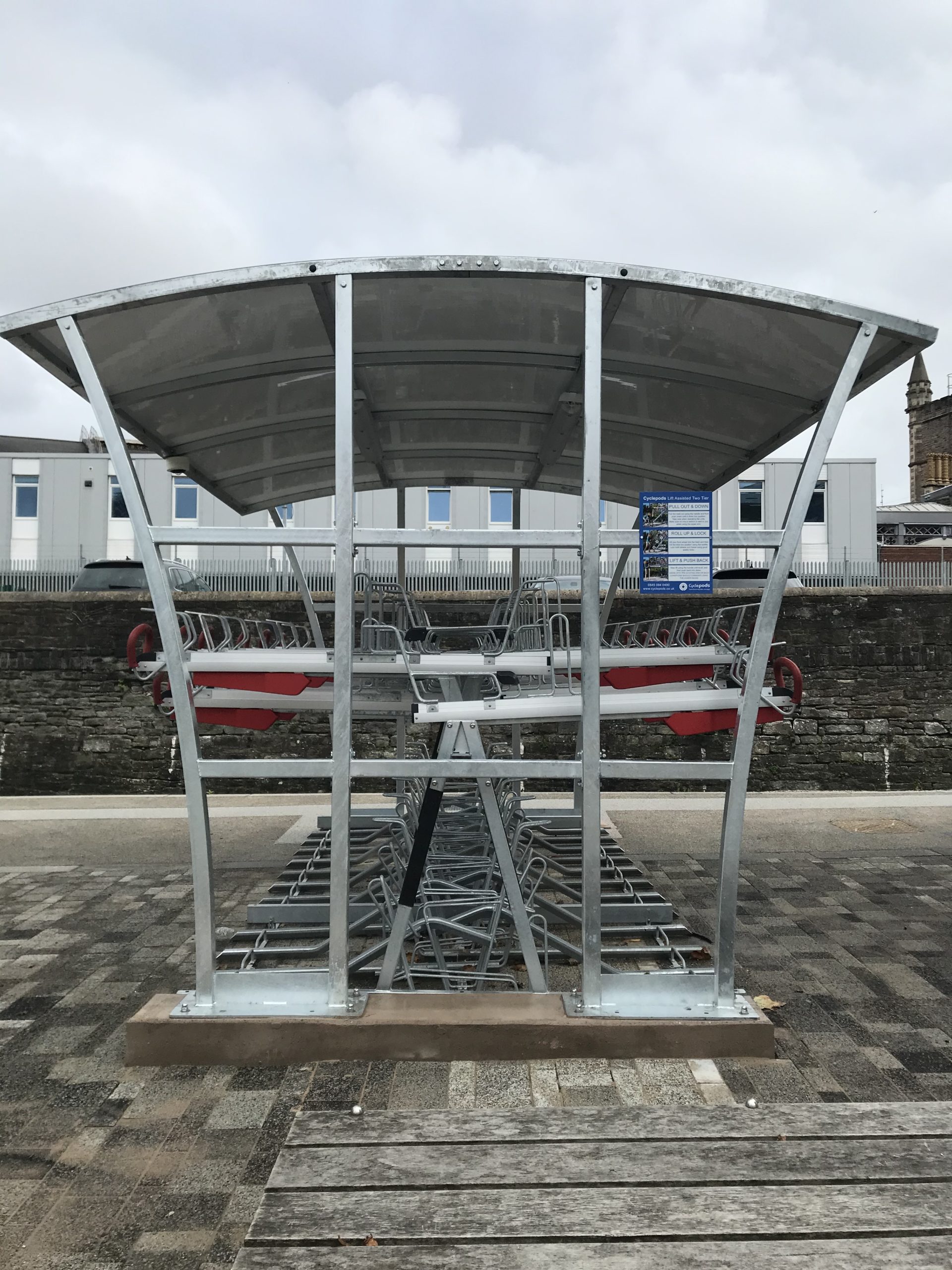 Within the shelters is Cyclepods’ Easylift Premium: “a highly convenient gas-assisted two level bicycle parking system” whose manufacturers promise that the lifting system ensures a bicycle can be parked on the top level “effortlessly”.