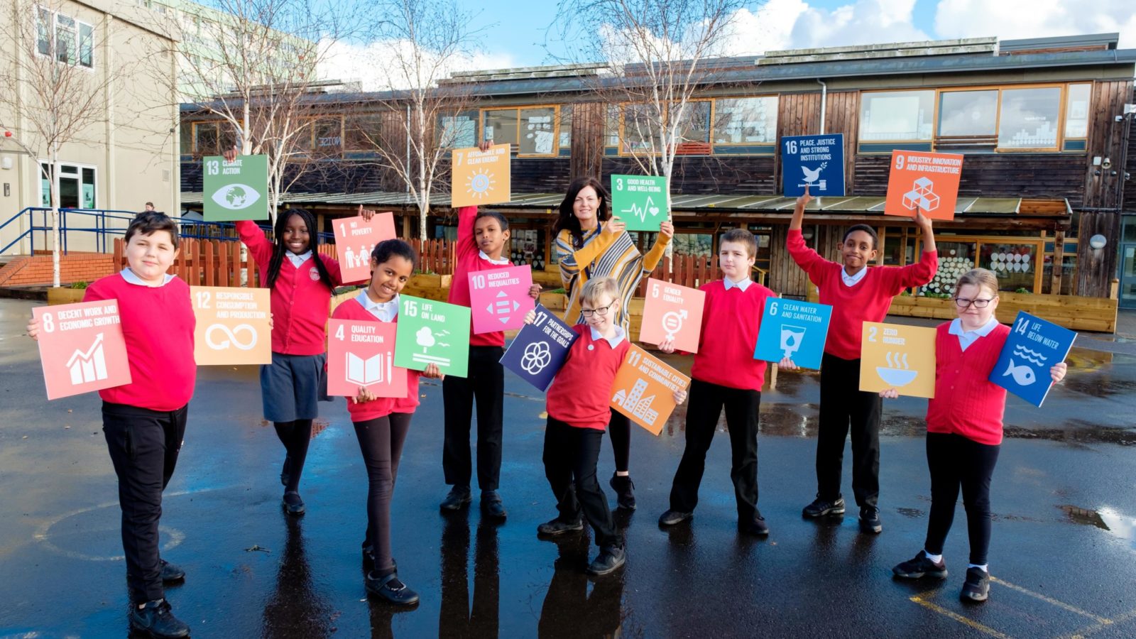 Children in Barton Hill pose with some one the Sustainable Development Goals – photo by @JonCraig_Photos 07778606070