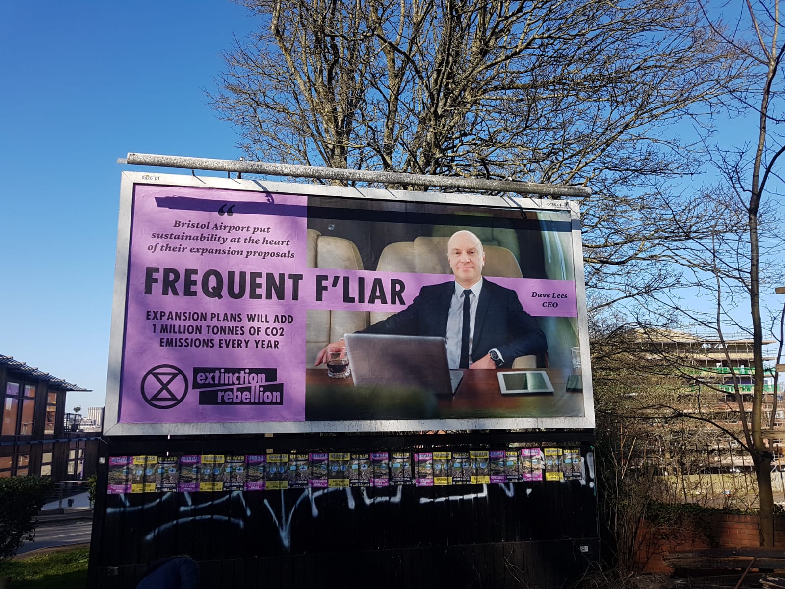 The campaign targets Bristol Airport chief executive Dave Lees, who appears on a billboard on Bath Road which brands him a “frequent f’liar”.