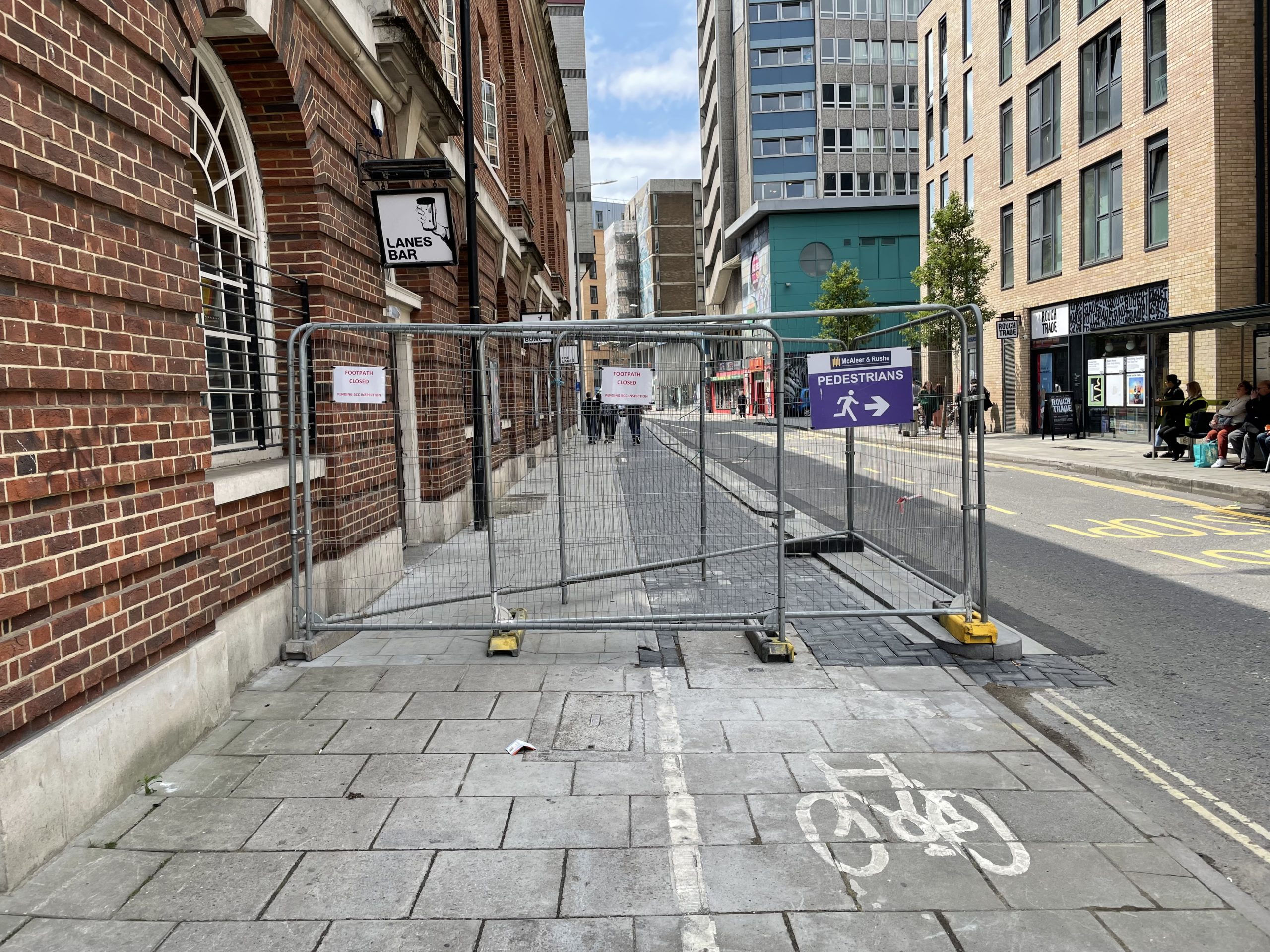 Before it was closed, the new cycle lane was a contraflow route heading from The Lanes towards St John on the Wall church, with a footpath next to it.