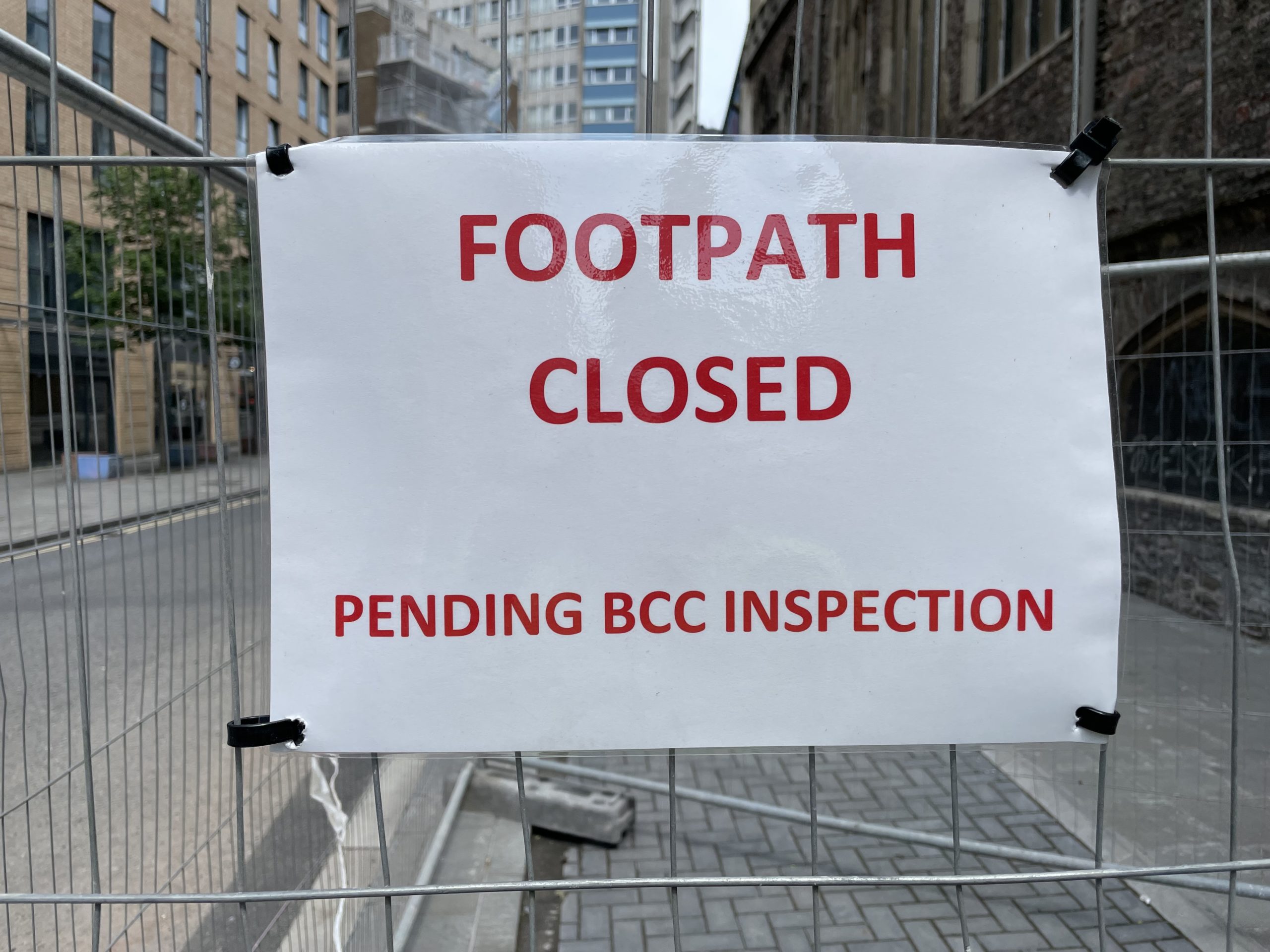 Signs say the footpath and cycle lane are closed ‘pending BCC inspection’