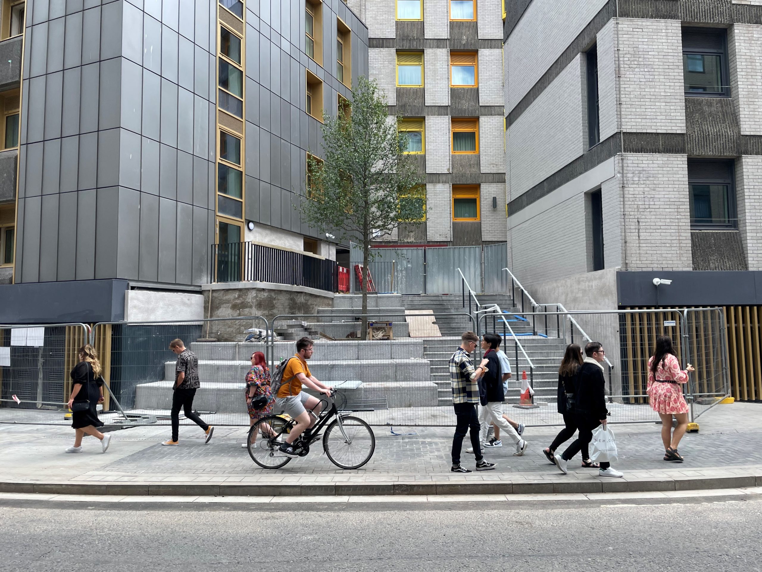 Metal barriers make the narrow pavement next to the cycle lane even more narrow, but Artisan Real Estate told Bristol24/7 that the railings will be replaced with bollards “commensurate to the door swing”