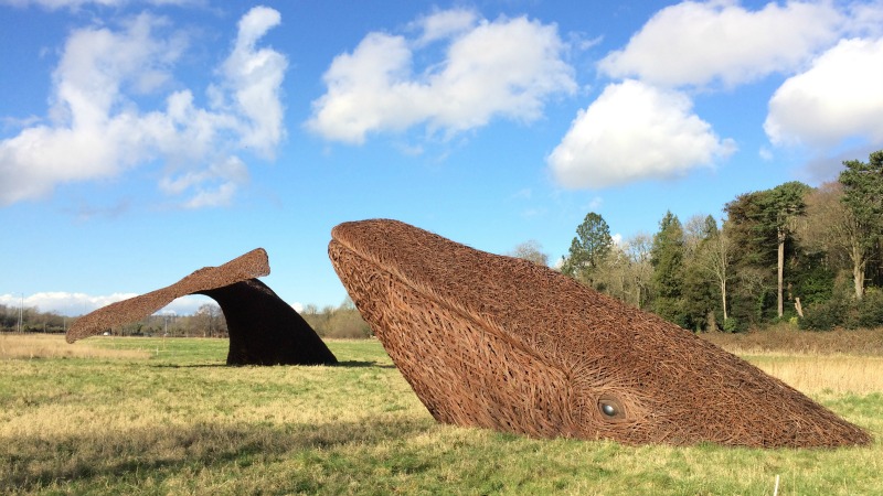 Designed and built by Cod Steaks and funded by Arts Council England, The whales are made from Somerset willow and depict the head of a humpback whale and the tail of a blue whale.