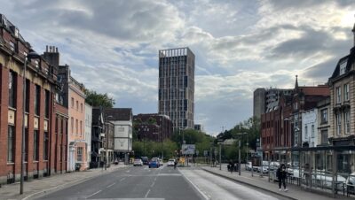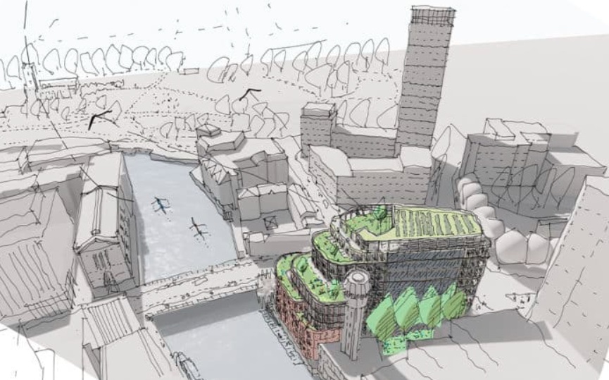 Currently covered in scaffolding, the distinctive concrete tower will be part of a new “landmark building” on the site of what is currently Heart FM and the BIMM Bristol music college.