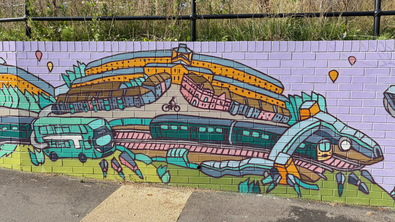 The mural, painted by artist Andy Council, shows a green train nestled within the amphibian’s body, with buildings from the area, cyclists and walkers making up fringes of the creature.