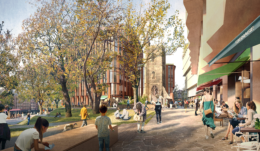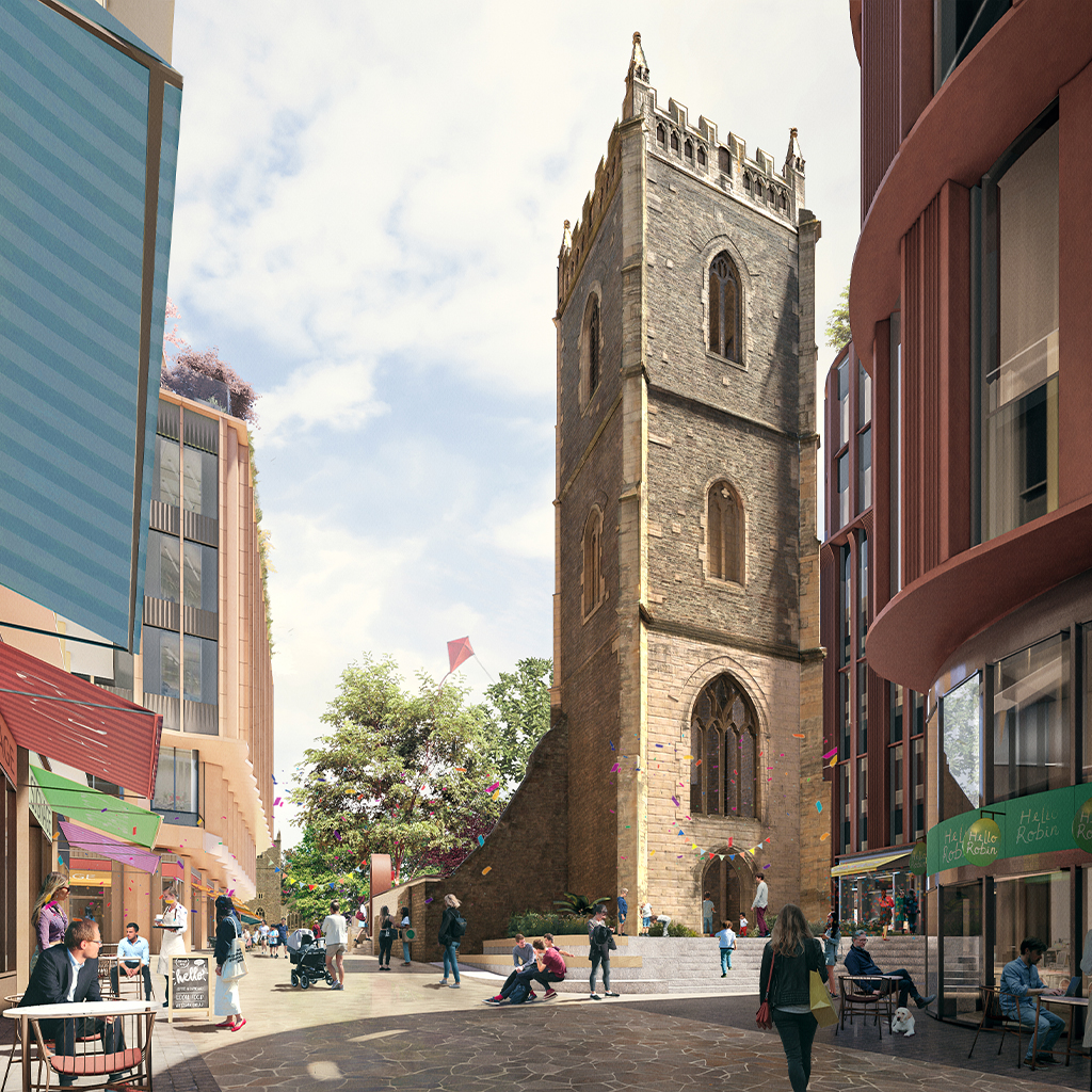 The developer will also expand the park, restore the ruined St Mary le Port church tower, and reinstate three historic city centre streets that were lost during the Blitz.