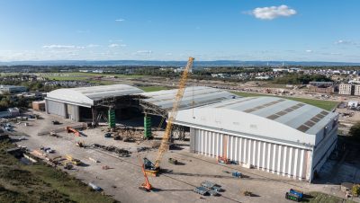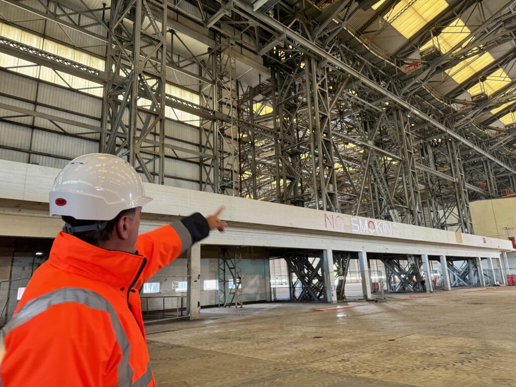 CEO Andrew Billingham describing how the hangar is being stripped back to its skeletal frame – photo: Hannah Massoudi