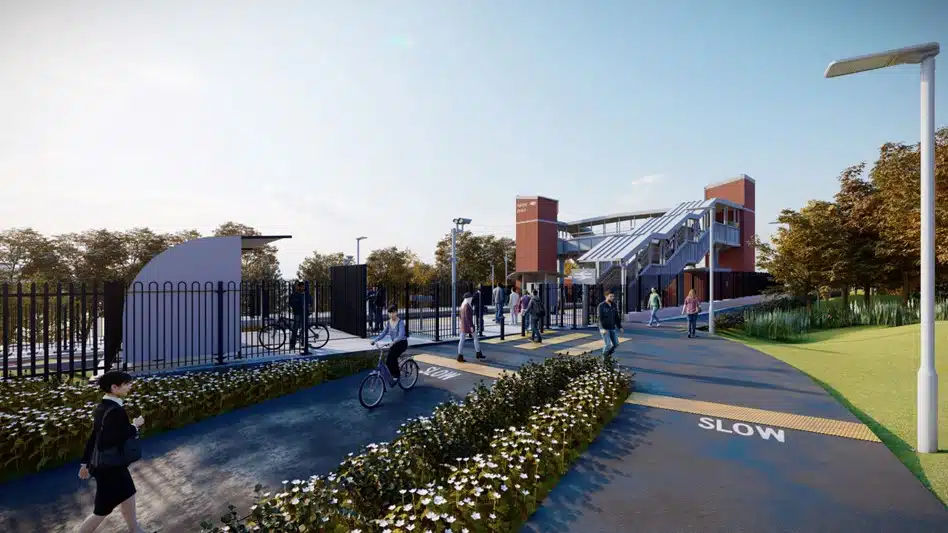 The new Ashley Down station entrance will be located on Concorde Way where the path meets Station Road – image: Network Rail