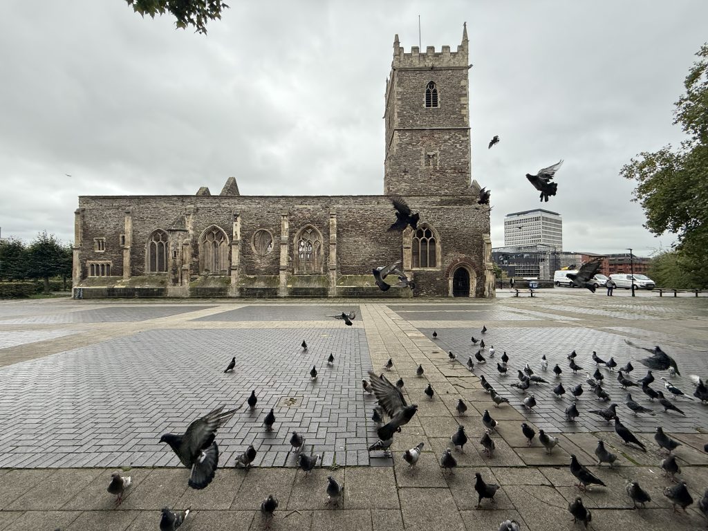 The bombed-out ruins of St Peter’s Church remain at the heart of Castle Park – photo: Martin Booth