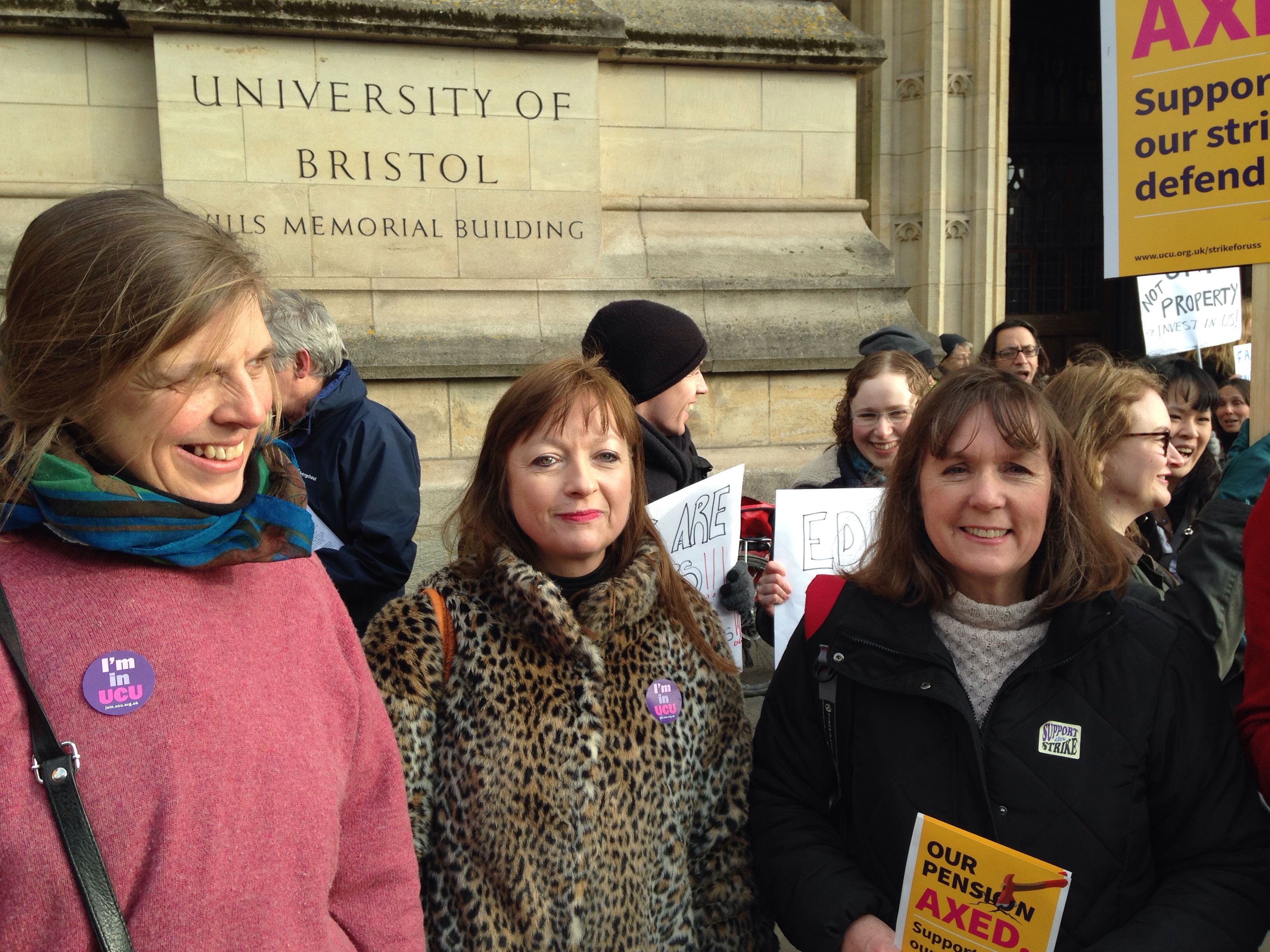 University of Bristol staff on the picket line. From left to right: Morag McDermot, Lois Bibbings and Charlotte Villiers