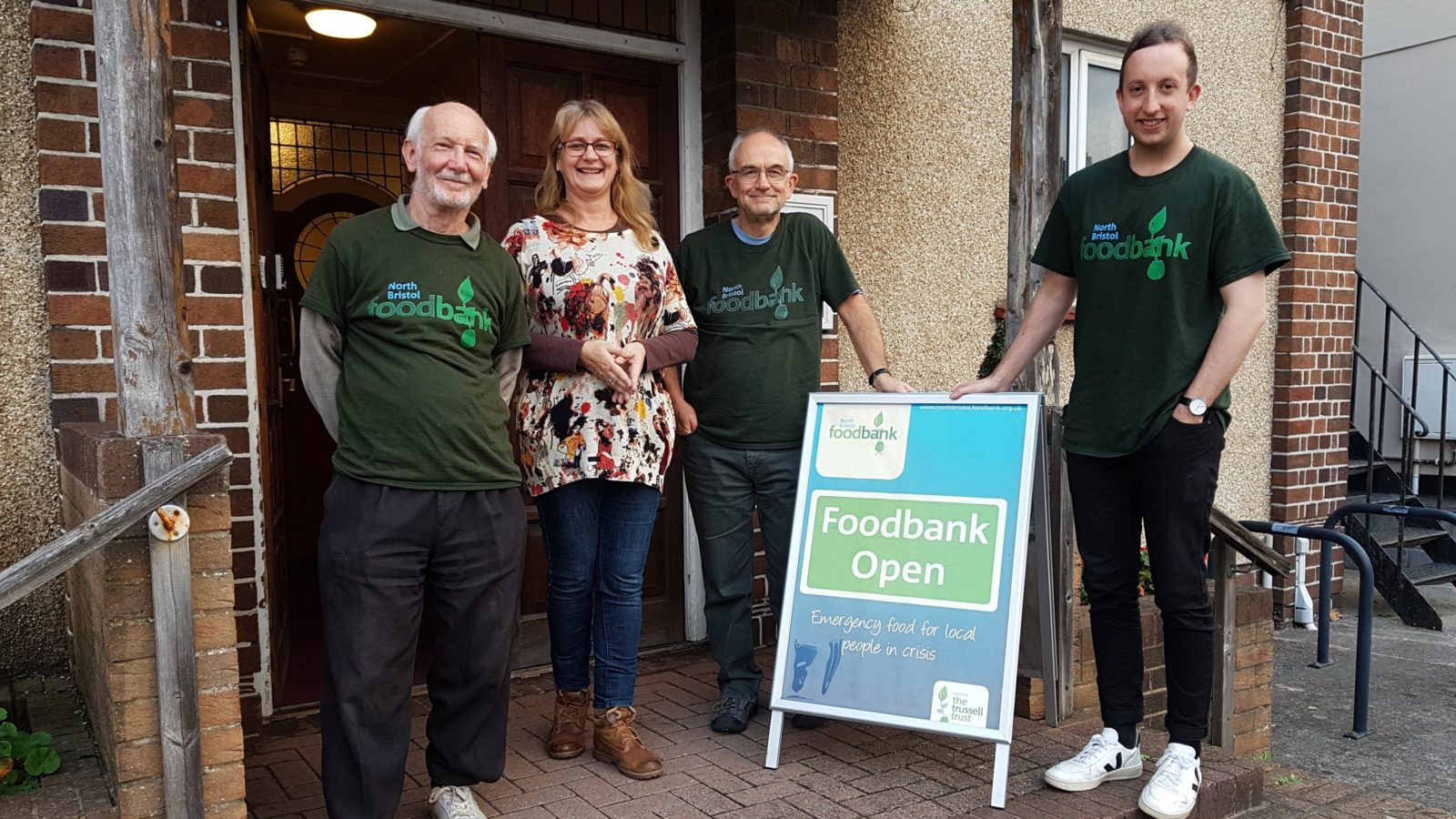 Main photo: Volunteers Peter Selleck, Emma Wall and Steve Clark with Bristol North Food Bank manager Matt Dobson