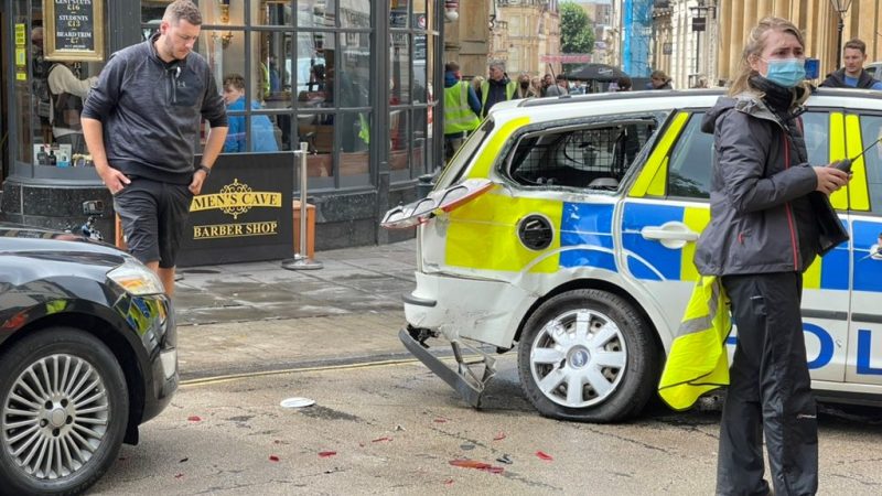 A black Ford Mondeo reversed at speed down Broad Street on Sunday morning before crashing into a stationary police car.