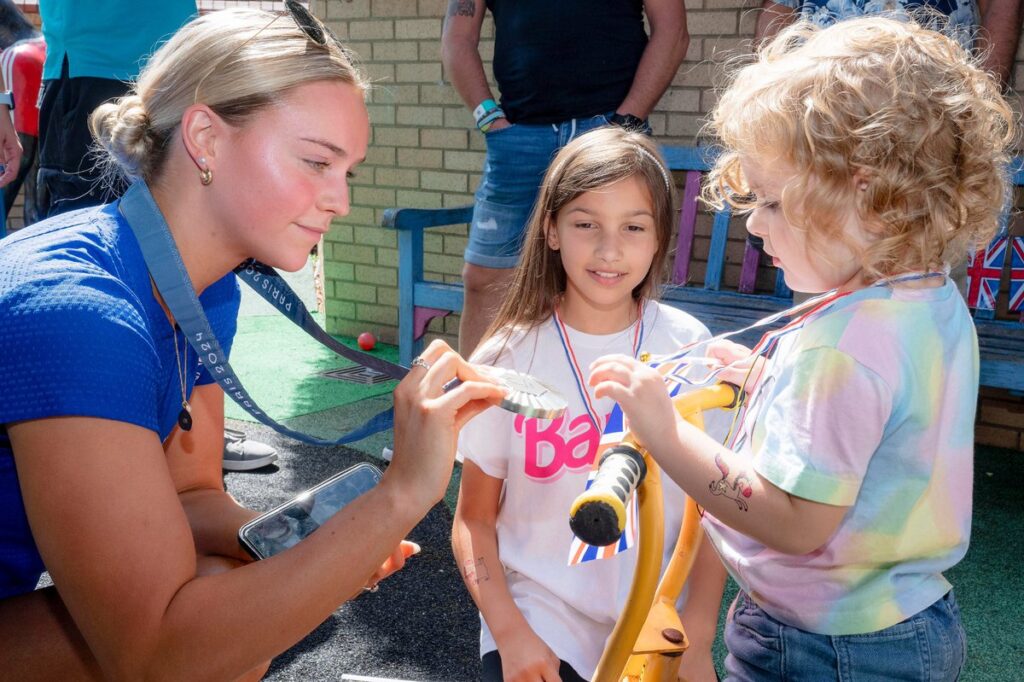 Izzy Thorpe and Kate Shortman met young patients and their families at the Children’s Hospital – photo: Grand Appeal