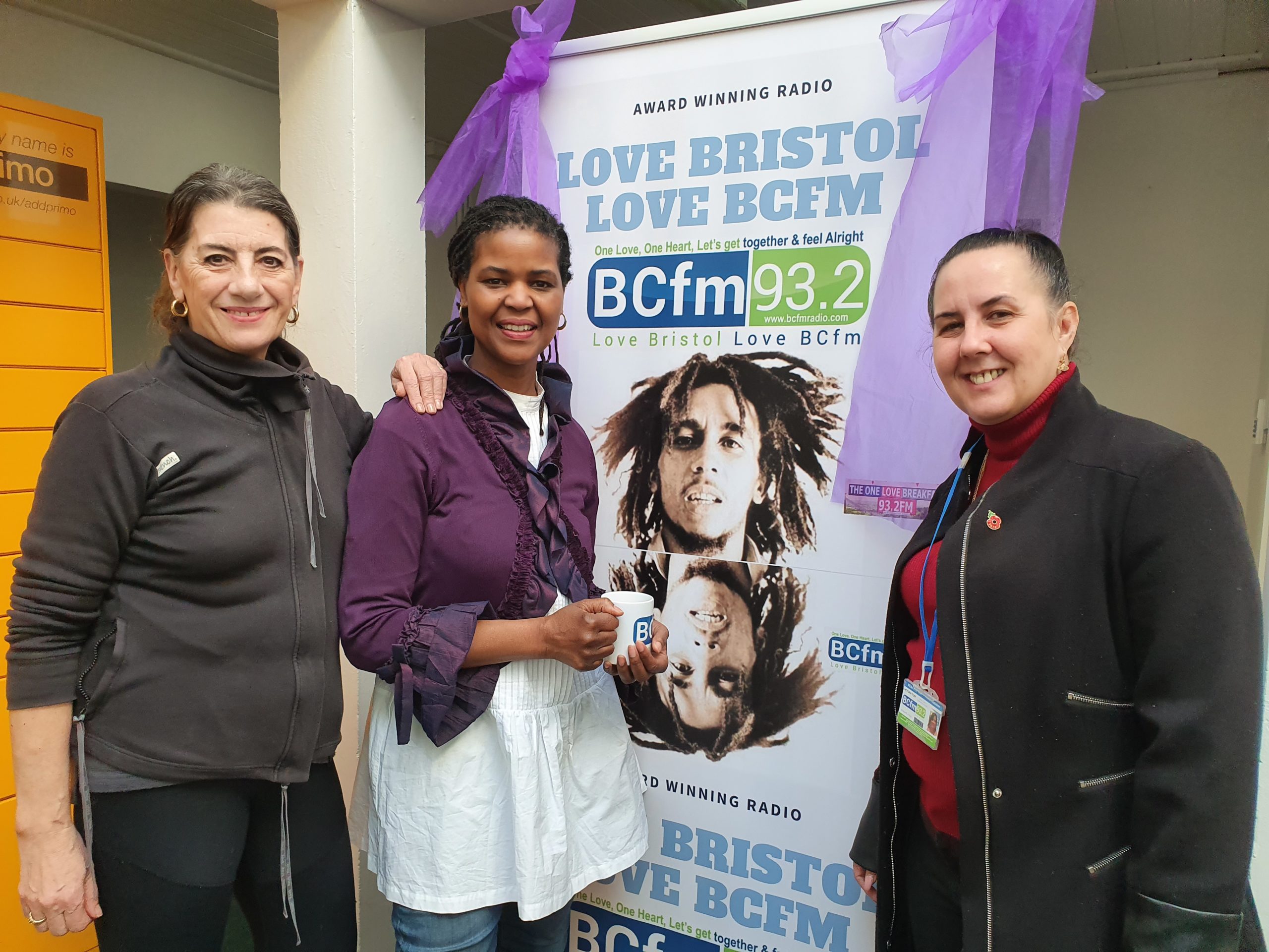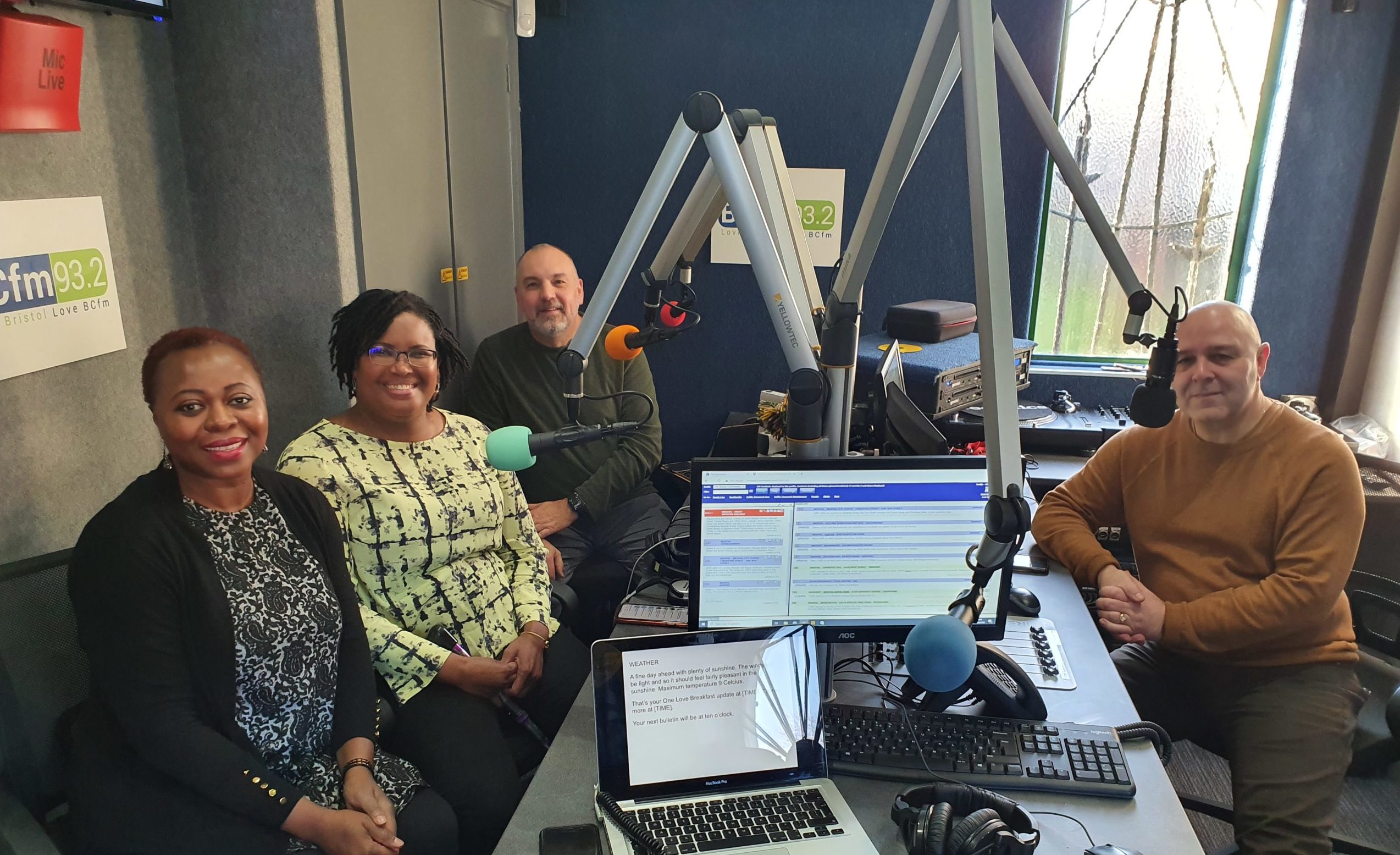 Guest Olivette Otele with BCfm’s Primrose Granville, Ivan Jackson and John Ford in the newly-opened BCFM studio. Photo by Ellie Pipe