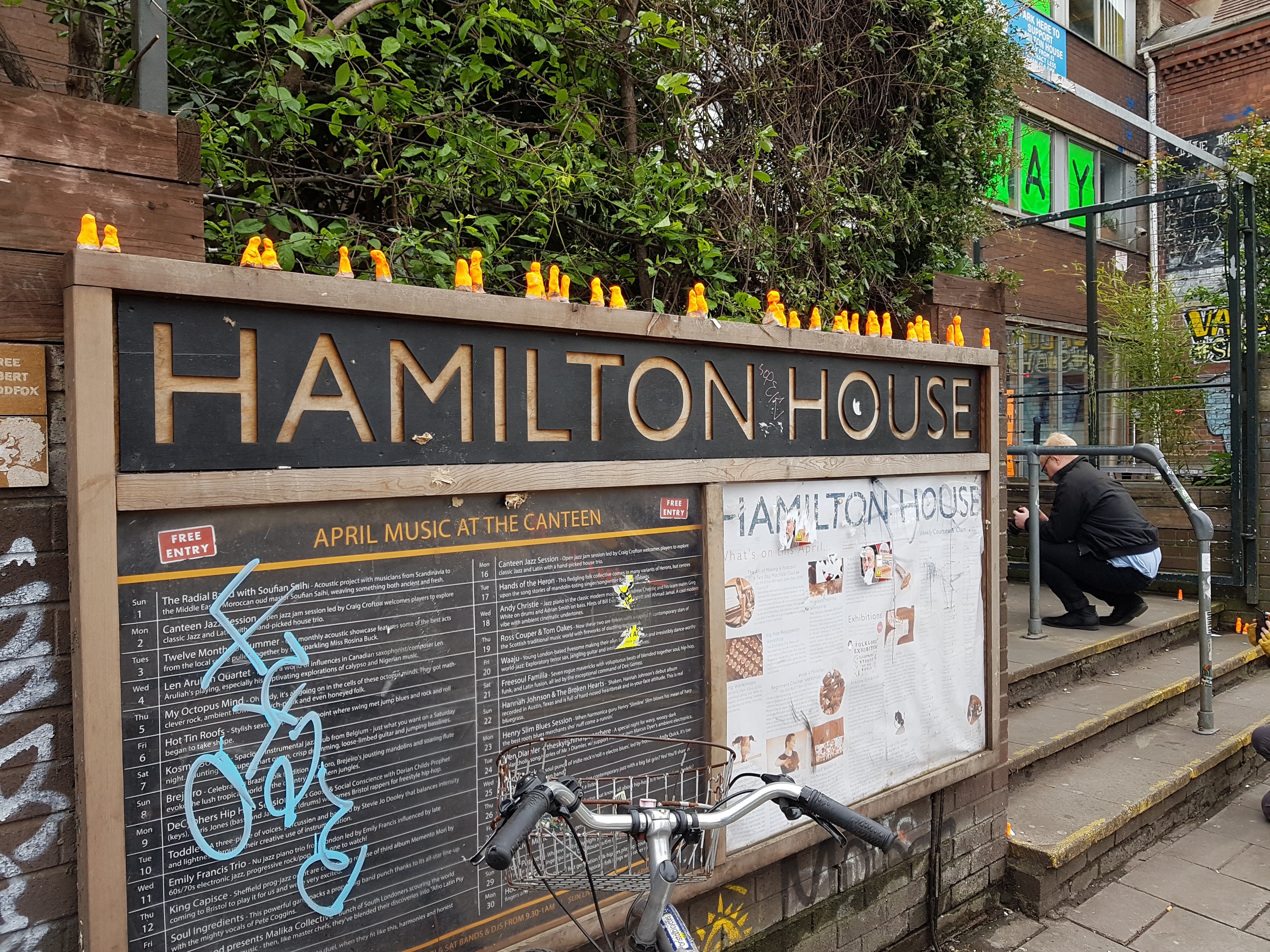 The orange figurines were placed to mark the artists who have had to leave Hamilton House (left-to right Tom McDonagh, Alice Tatton-Brown and Lara Luna Bartley)