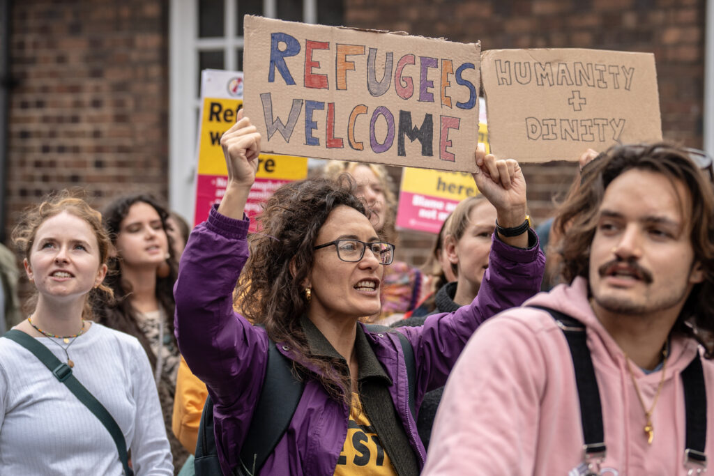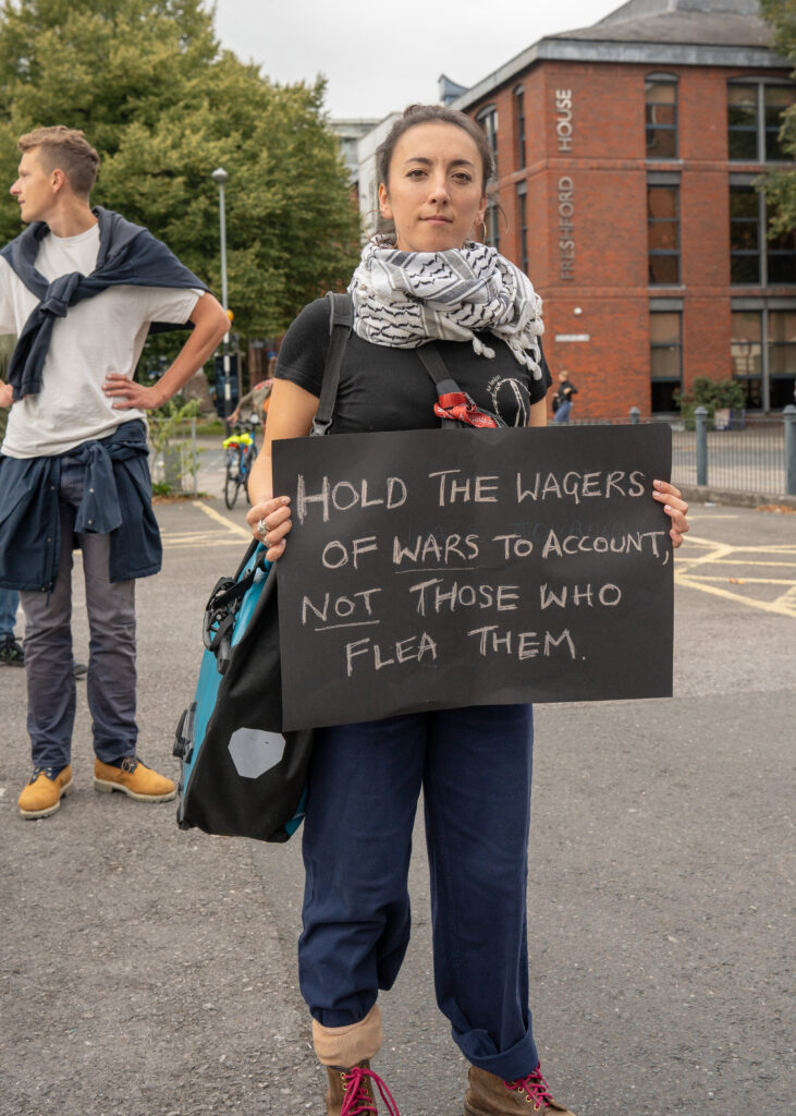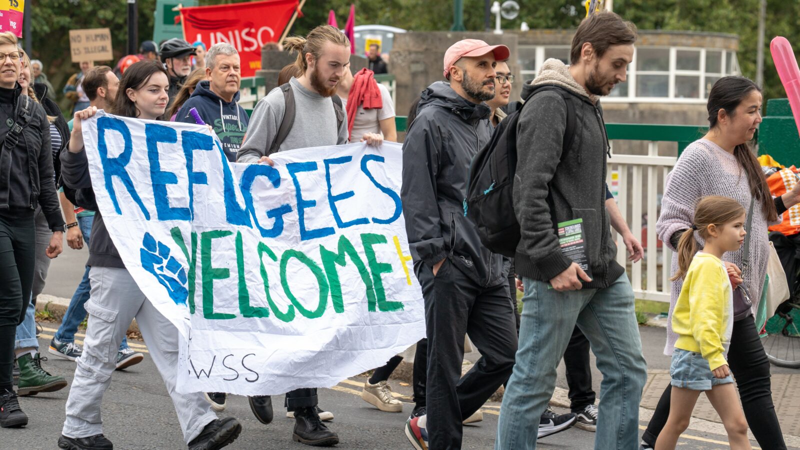 Placards contained slogans including ‘no-one is illegal’ and ‘migrants make our NHS’, with car horns beeped and bicycle bells rang as the march made its way around the city centre.