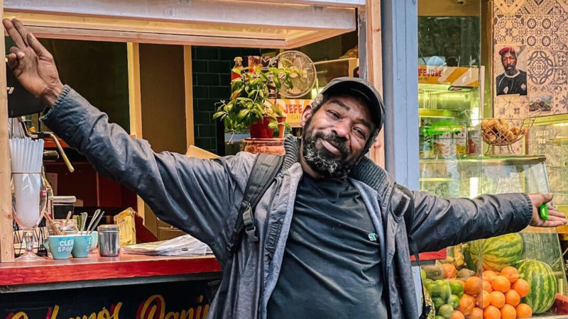 Jeff Knight is a well-known and treasured character who can usually be spotted at his pitch outside The Canteen on Stokes Croft – brightening the days of passers-by with his jovial greetings and customary fist-bumps.