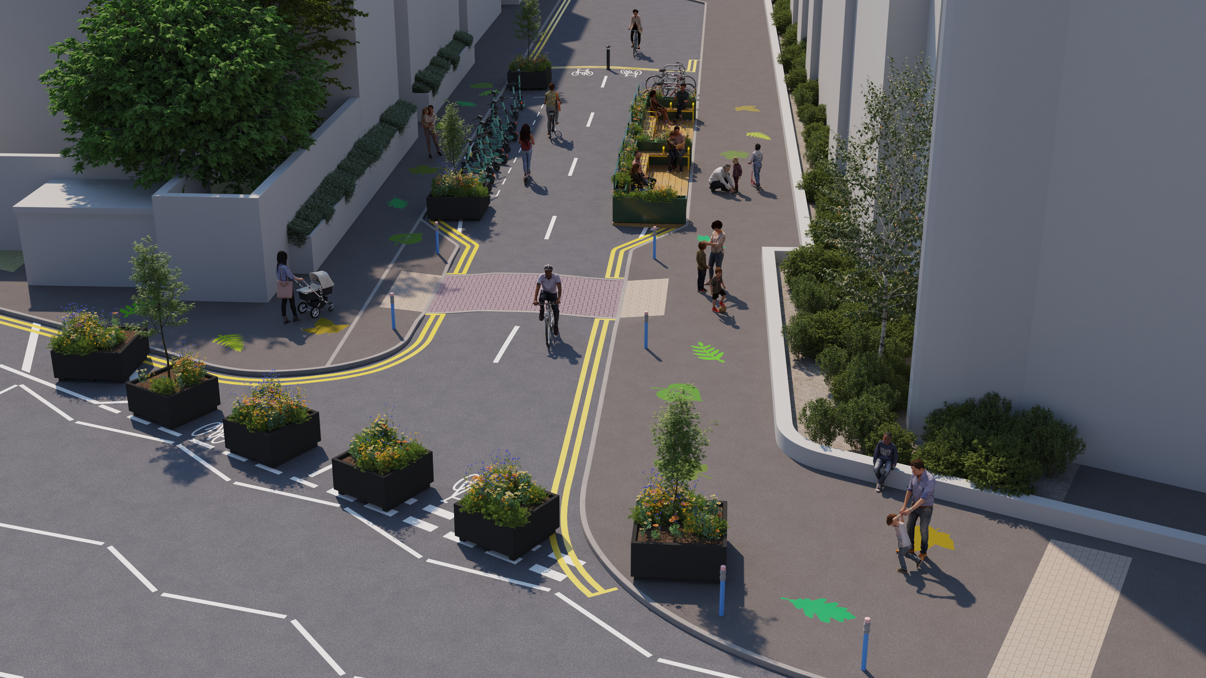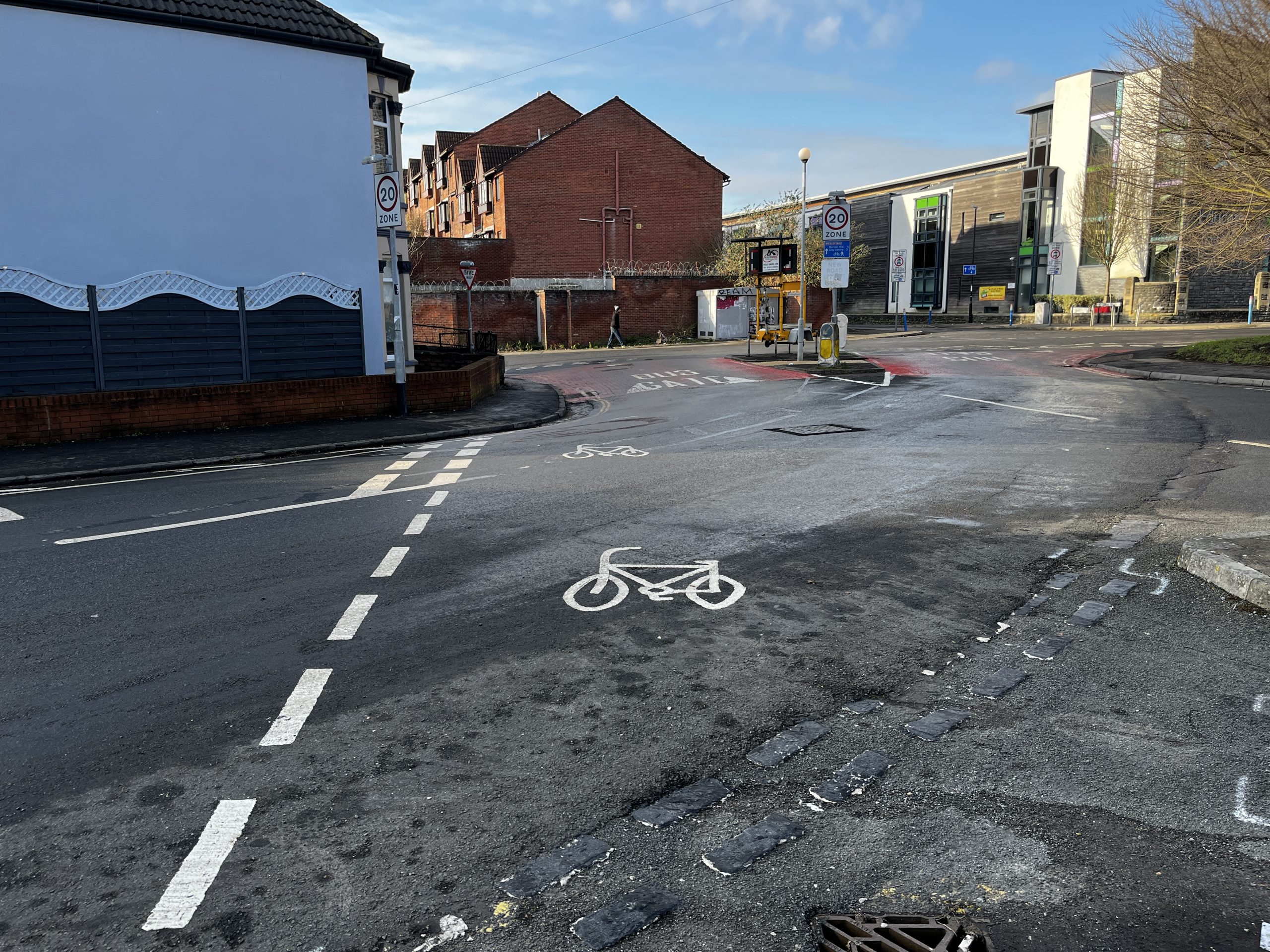 At the top of Marsh Lane for example, paint outlines where a planter was planned to be installed. However this was the scene of a stand-off in 2024 between contractors working for the council, and protesters who blocked their way.